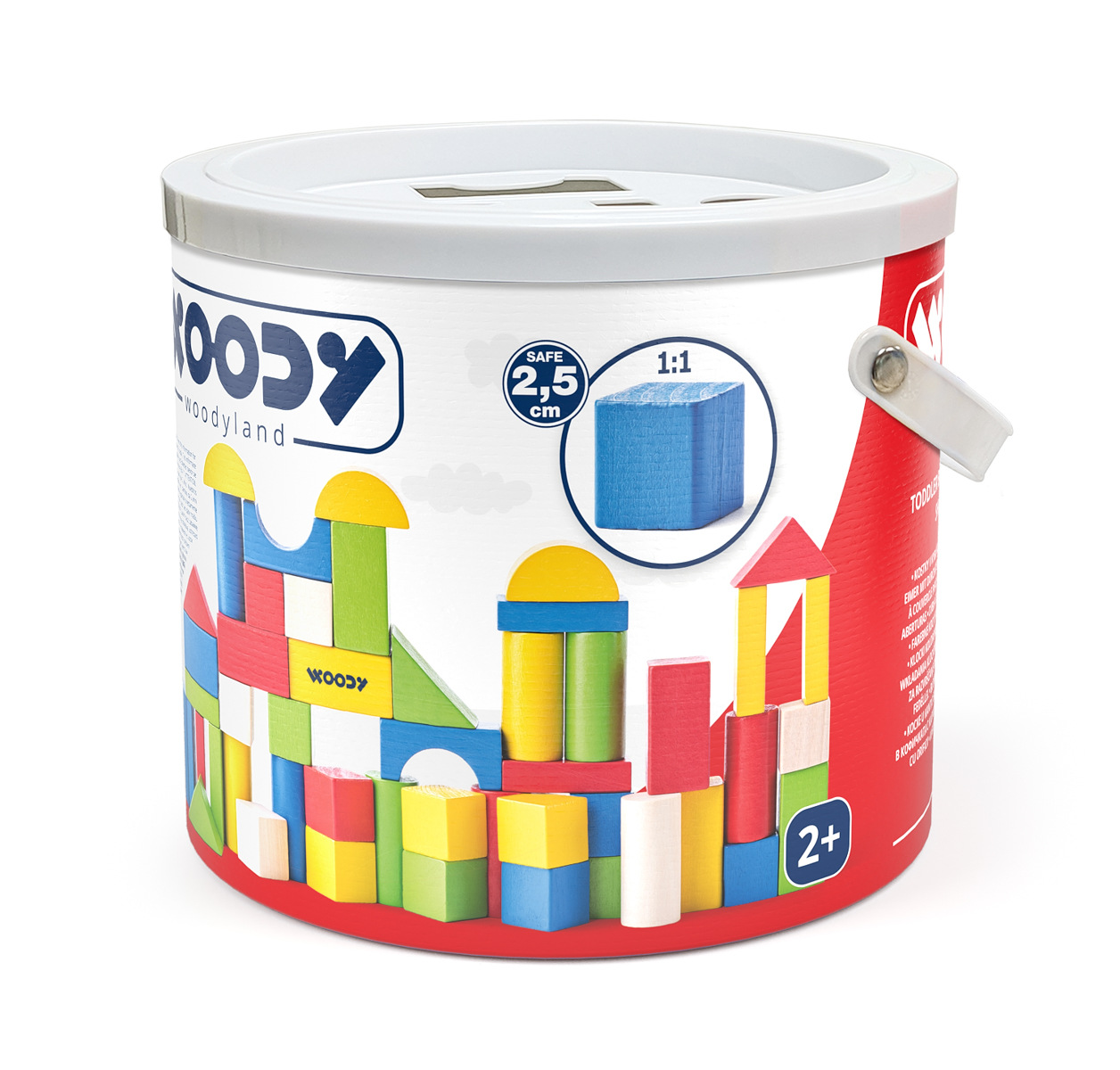 Klasická stavebnice z barevných a přírodních kostek ve vysoce kvalitním provedení. Kostky jsou umístěny v kyblíku, jehož víko je zároveň prostrkávadlem pro kostky všech tvarů, které stavebnice obsahuje. | Velikost krychle: 2,5cm | Věk: 2+ | Počet ks: 100