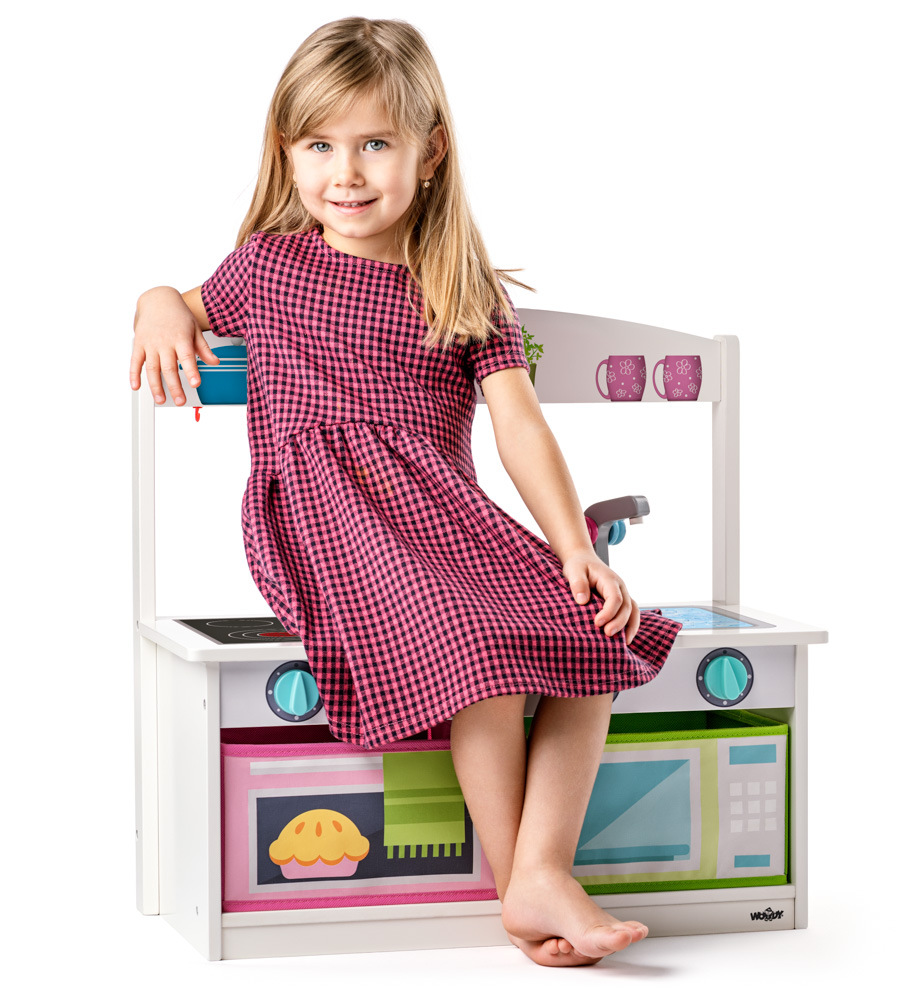 Židlička s úložným prostorem pro hračky je zároveň i sporákem s otočnými knoflíky. Vhodný k rozšíření kuchyňské linky 90258. Rozměr: 34 x 31,5 x 56 cm. Výška pracovní desky: 28,5 cm. Věk: 3+