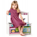 Tato multifunční kuchyňka nabízí z každé své strany jinou aktivitu. Z čelní strany obsahuje troubu, mikrovlnku se světlem a zvukem, kávovar, myčku, dřez i varnou desku s červeným podsvětlením a zvuky reálného vaření. Z pravého boku najde dítě pračku s košem na prádlo, z levého boku pak žehlící prkno s žehličkou. Zadní strana je tvořena tabulí a mapou. Jako bonus jsou součástí tohoto výrobku i kartičky s obrázky odpadků, které dítě třídí a vkládá do správných otvorů pro tříděný odpad. Příslušenstvím je nádobí z kvalitního plastu a dřeva a rovněž zástěra s kuchařskou čepicí. | Rozměr výrobku: 60 x 28 x 97 cm | Věk: 3+