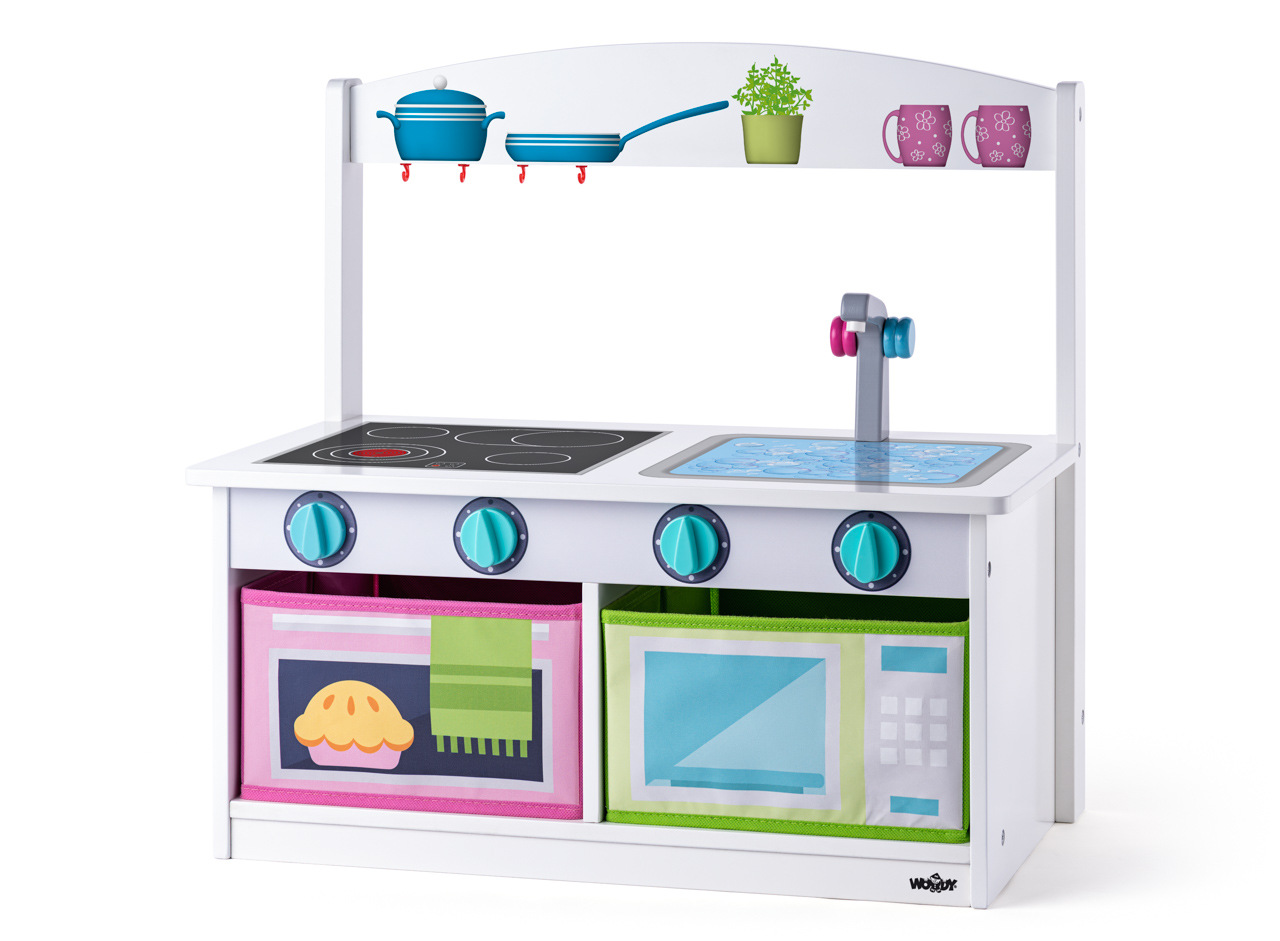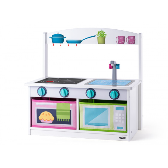 Lavice s úložným prostorem pro hračky je zároveň i kuchyňkou s otočnými knoflíky a vodovodní baterií, která se upevní na vrchní desku pomocí magnetu. Obsahuje: 3 dílky. Rozměr: 59 x 31,5 x 58 cm. Výška pracovní desky: 28,5 cm. Věk: 3+