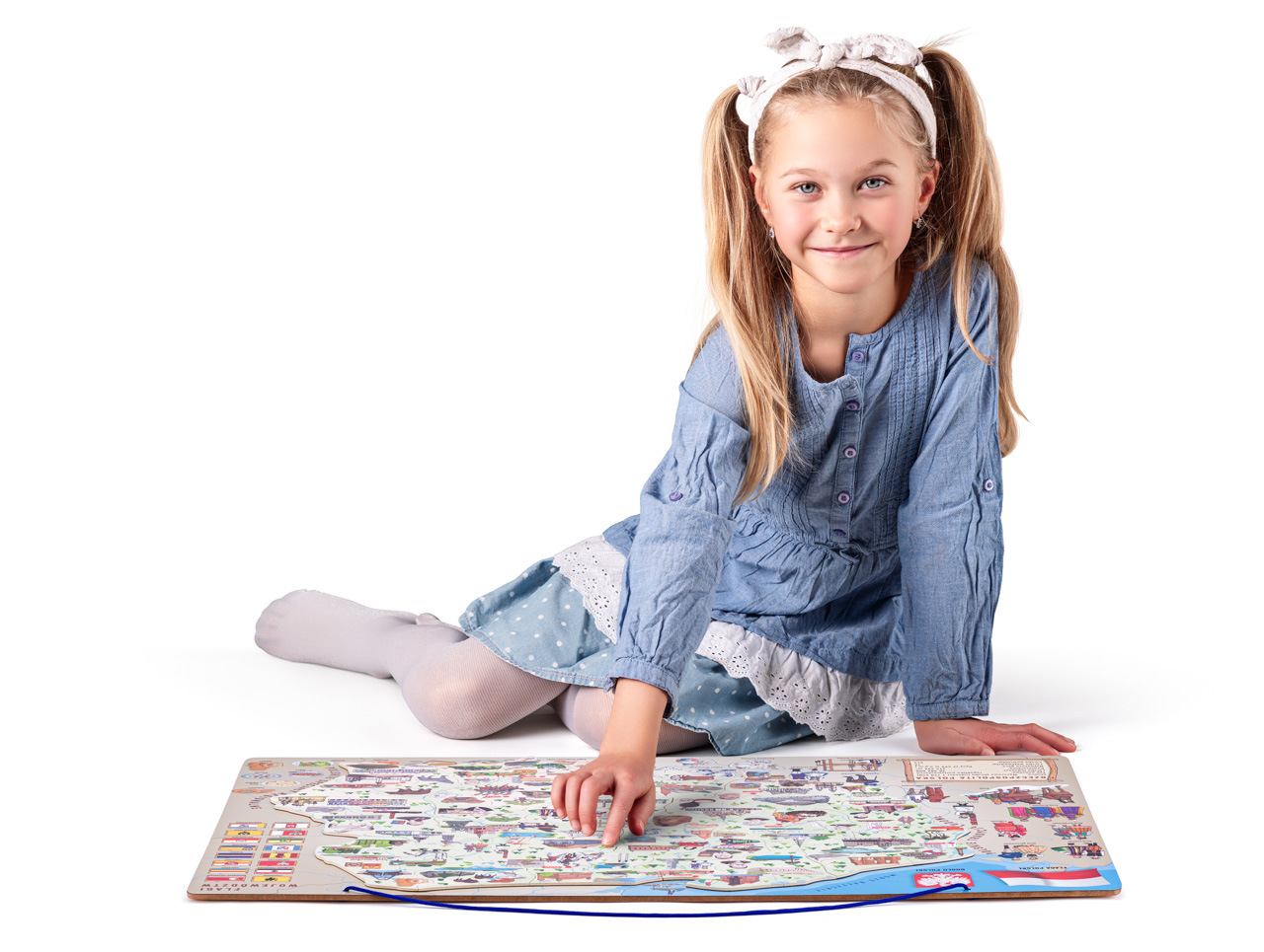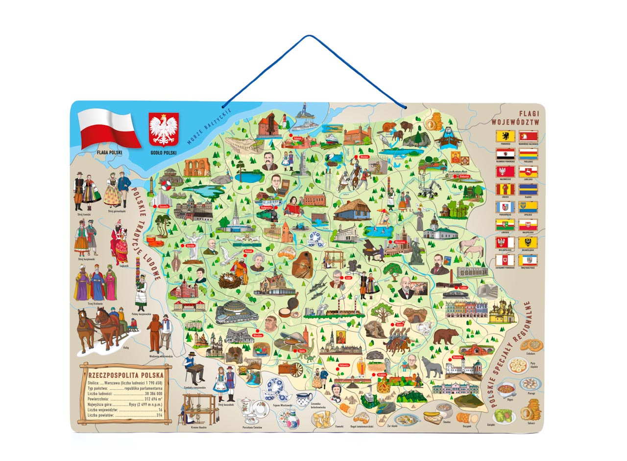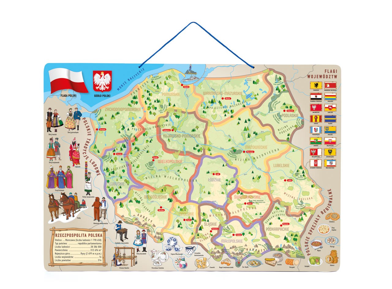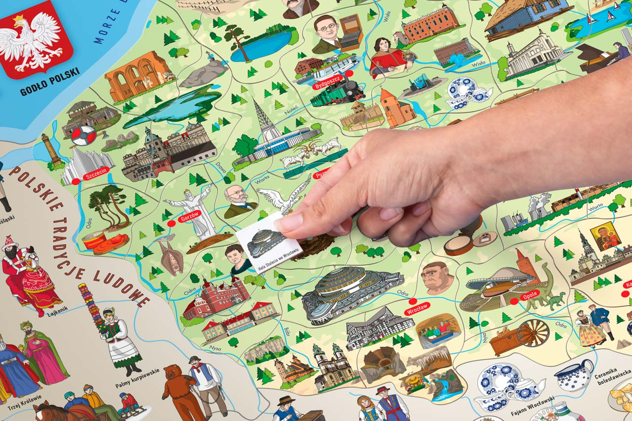 Naučné puzzle, školní pomůcka a společenská hra v jednom! Cílem je naučit vnímat dítě svou zemi jako celek plný zajímavostí. Současně se zde dítě naučí rozčlenit Polsko do jednotlivých vojvodství a určit jejich hlavní města. Na podkladové desce jsou rovněž zakresleny řeky a pohoří. Dítě přikládá dílky znázorňující jednotlivé okresy na podkladovou magnetickou plochu. Hranice jednotlivých vojvodství jsou vyznačeny výraznou linkou, která pomůže dítěti určit, kam který dílek patří. Později už bezpečně ví a osvojí si znalost, kde se jednotlivé vojvoství nacházejí, s kterými sousedí atd... Díky obrázkům umístěným na každém dílku si děti ihned uvědomí, co je pro každý okres charakteristické, co se kde pěstuje, vyrábí, těží, kde jaká zvířata žijí, event., kde se jaká stavba, budova, hrad či zámek nachází. S kompletně poskládanou mapou si pak s rodiči nebo kamarády zahrají hru, která bystří smysly a trénuje postřeh. Design a kresby pocházejí od českých návrhářů.| Věk: 3+ | Rozměr: 77 x 47 x 0,5