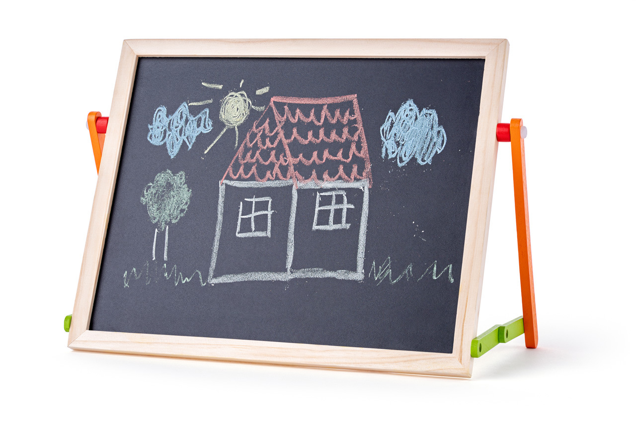 Tato dřevěná tabule je oboustranná. Jedna strana je bílá pro psaní suchými fixy a druhá černá pro klasické křídy. Bílá strana je vyrobena z kovového plechu, takže na ní drží magnetky. Plocha na kreslení má rozměry 30 x 35 cm a celková výška tabule je 65 cm. | Věk: 3+ | Rozměry: 41 x 65 x 33 cm