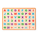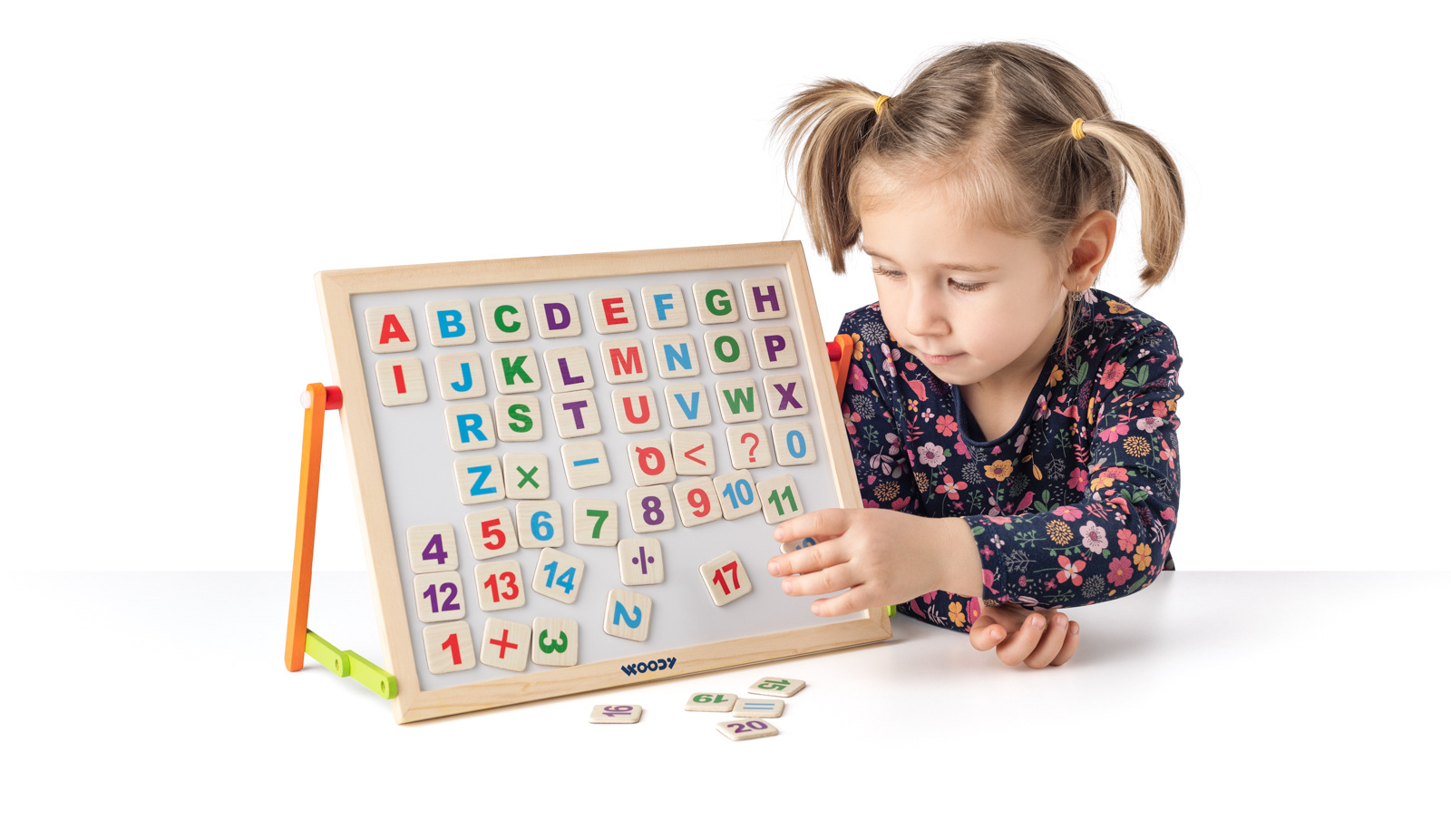 Oboustranná stolní tabule. Z jedné strany černá plocha pro psaní křídami, z druhé bílá magnetická plocha pro psaní fixou. Obsahuje velké množství magnetických písmen, čísel i znaků pro nácvik skládání slov i jednoduchých matematických příkladů, dále pak barevné křídy, fix a houbičku. Obsahuje: 57 dílků. Rozměr: 32 x 15 x 26 cm. Věk: 3+