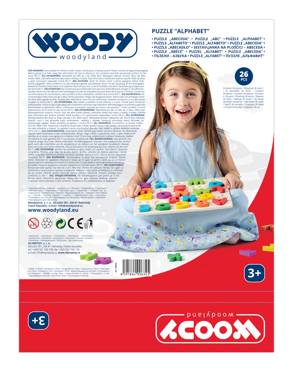 Dítě vkládá písmena do správných výseků. Vhodné pro předškoláky. Obsahuje: 26 dílků. Rozměr desky: 30 x 30 x 1,8 cm. Rozměr balení: 30 x 30 x 1,8 cm. Věk: 3+