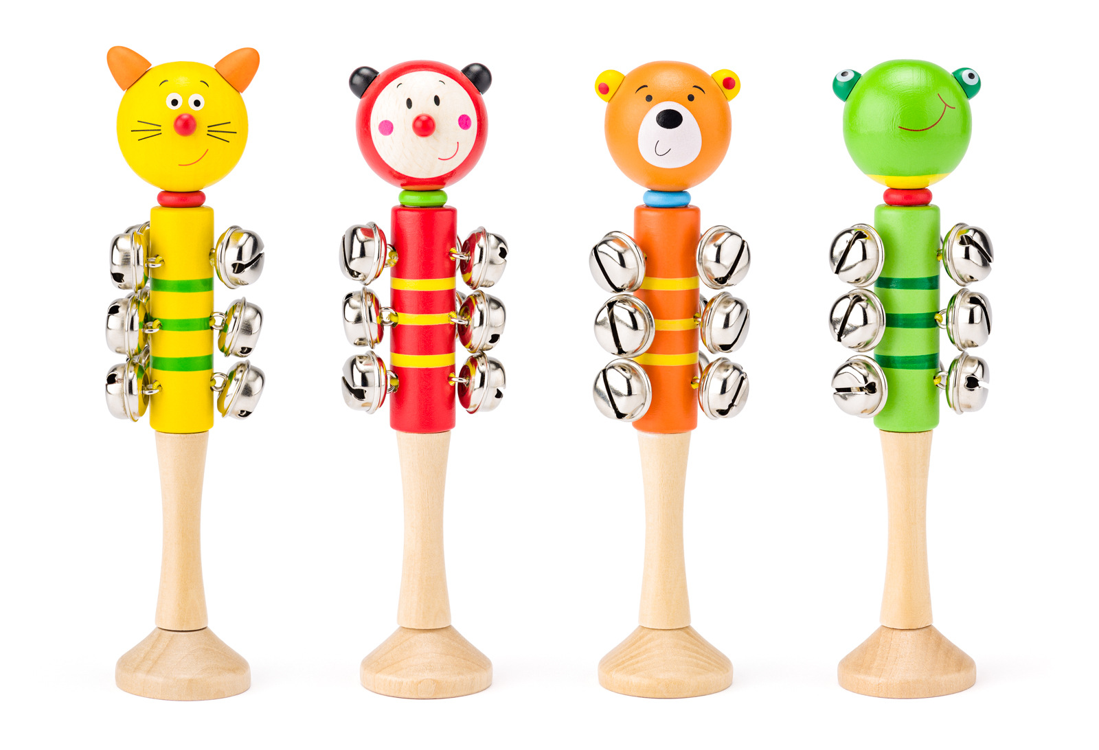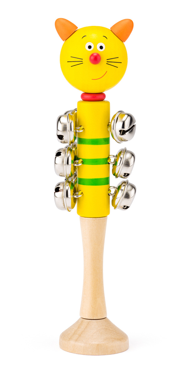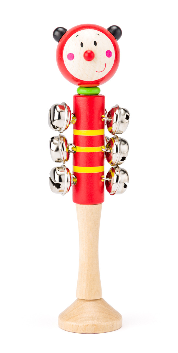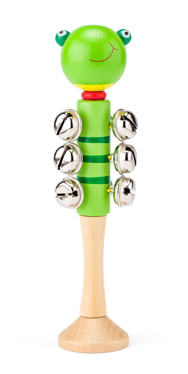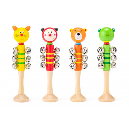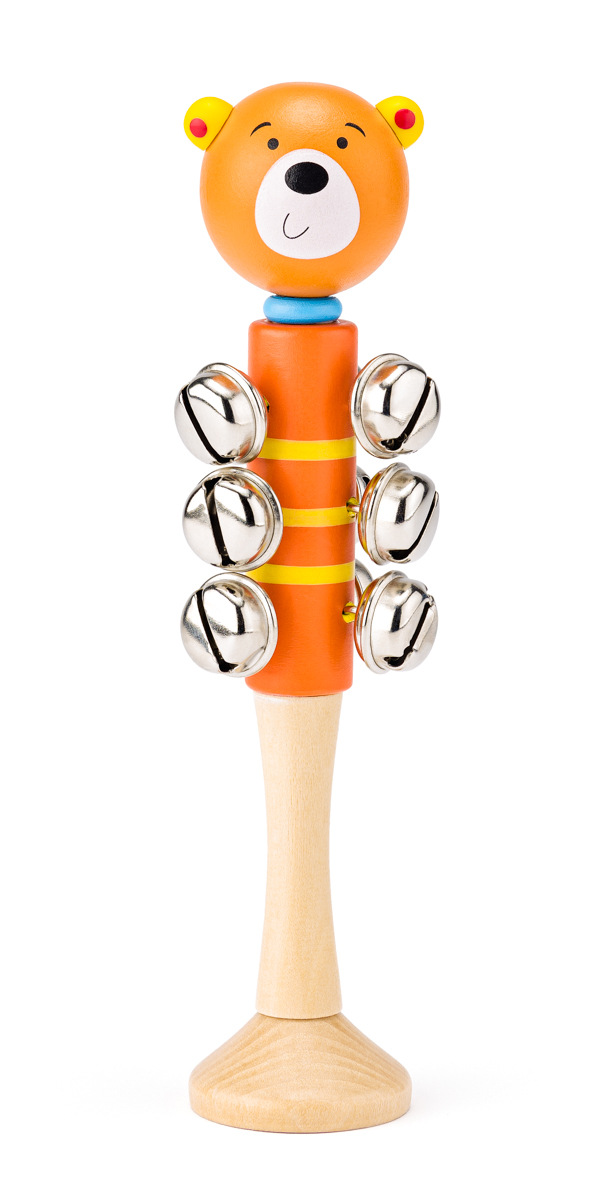 4 rolničky umístěné na dřevěné hůlce s hlavičkou zvířátka. Zvuk rolniček rozezvučí každou písničku. Hračka rozvíjí rytmus a hudební sluch.| Věk: 3+| Rozměr: 20 cm