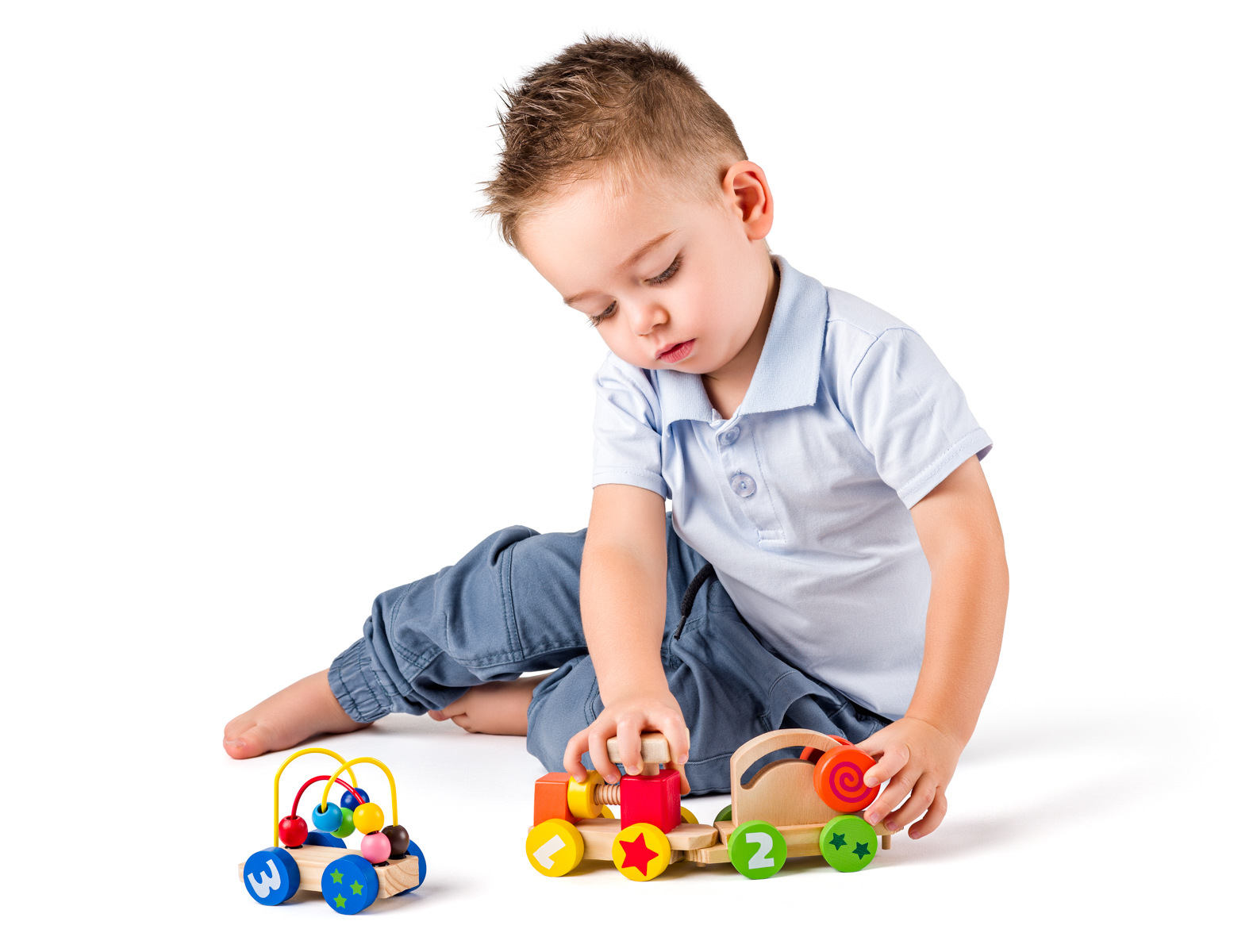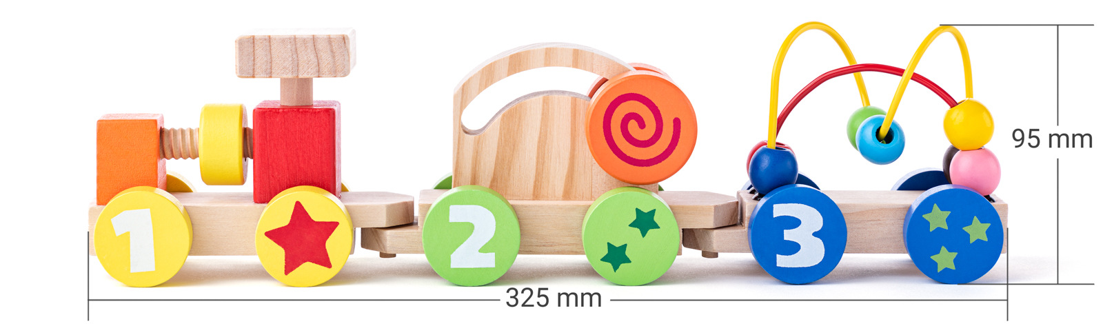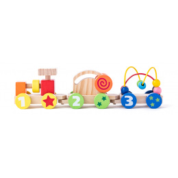 Vláček pro nejmenší nabízí dětem hned několik prvků k procvičení jemné motoriky: šroub na lokomotivě, korálky na drátěné konstrukci a pohyblivé kolečko.| Rozměr: 32,5 x 9 cm| Rozměr balení: 35 x 7,5 x 9 cm. | Věk: 18m+