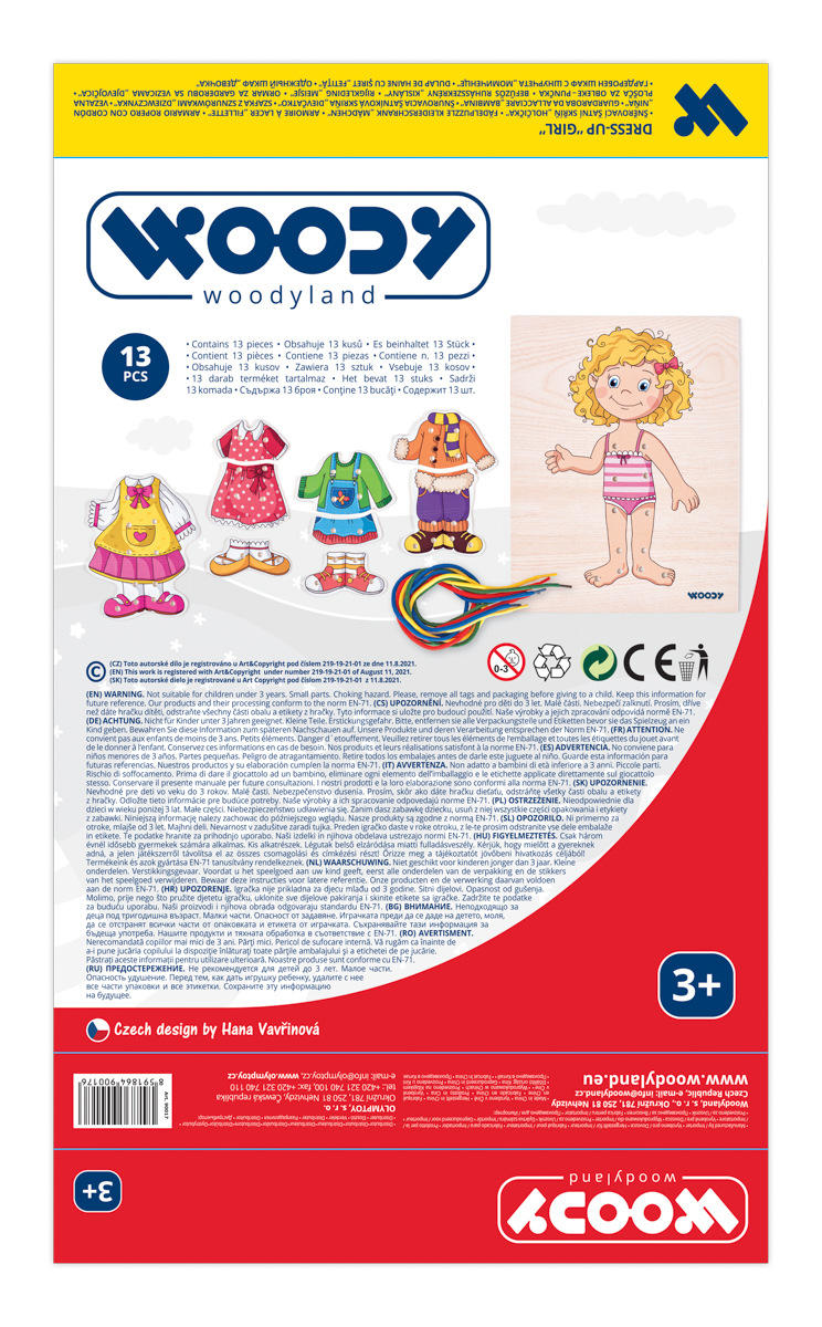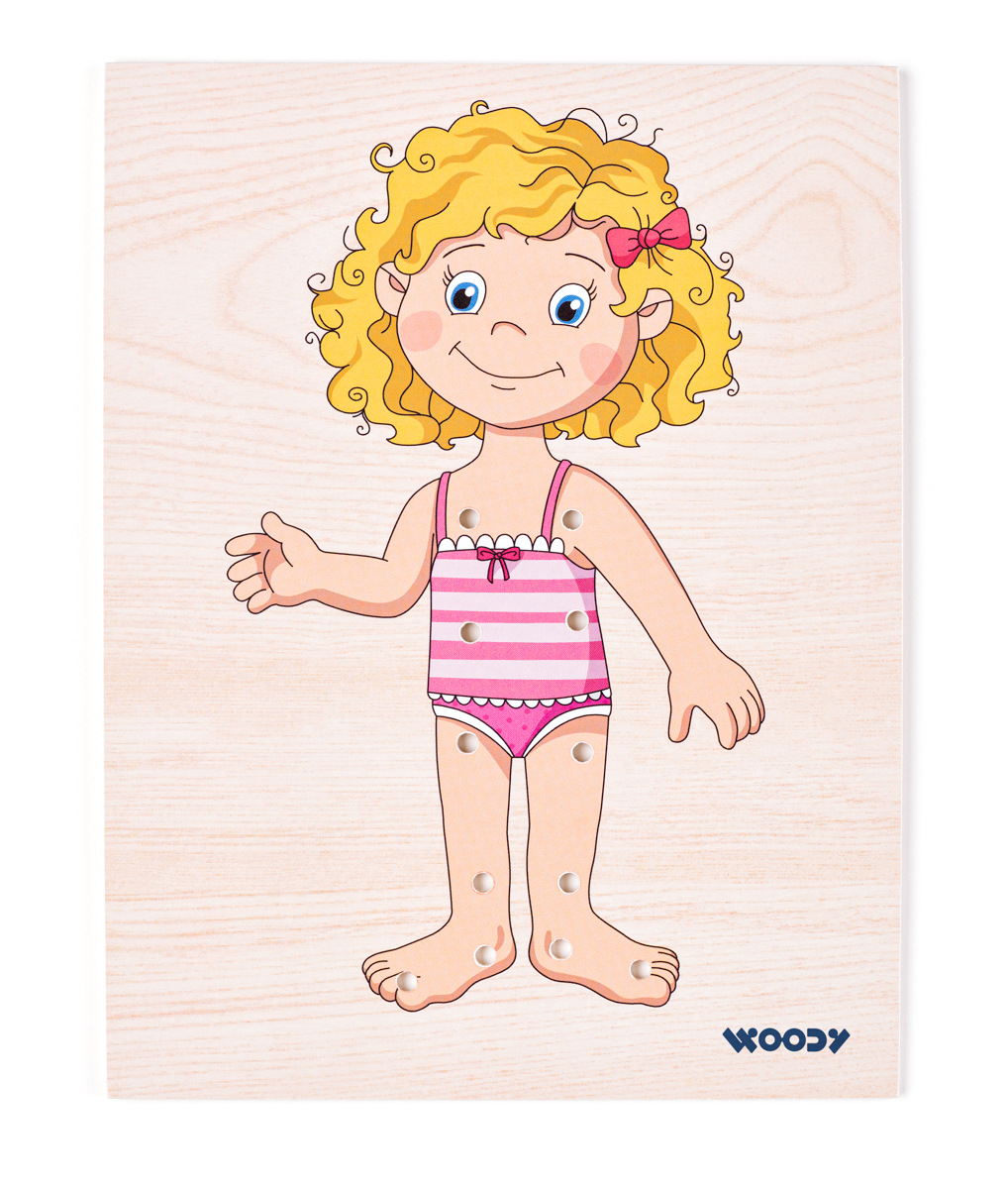 Děti dle vlastní fantazie oblékají postavičku holčičky. K dispozici mají několik variant oblečení. Holčička namalovaná na vysouvacím víku krabičky má na těle otvory, které umožňují přichycení oblečků tkaničkami. Design české výtvarnice. Součástí balení jsou 4 barevné tkaničky. Tato hračka rozvíjí jemnou motoriku, logiku a fantazii. | Věk: 3+ | Rozměr krabičky: 18,5 x 23 x 2,5 cmVíce