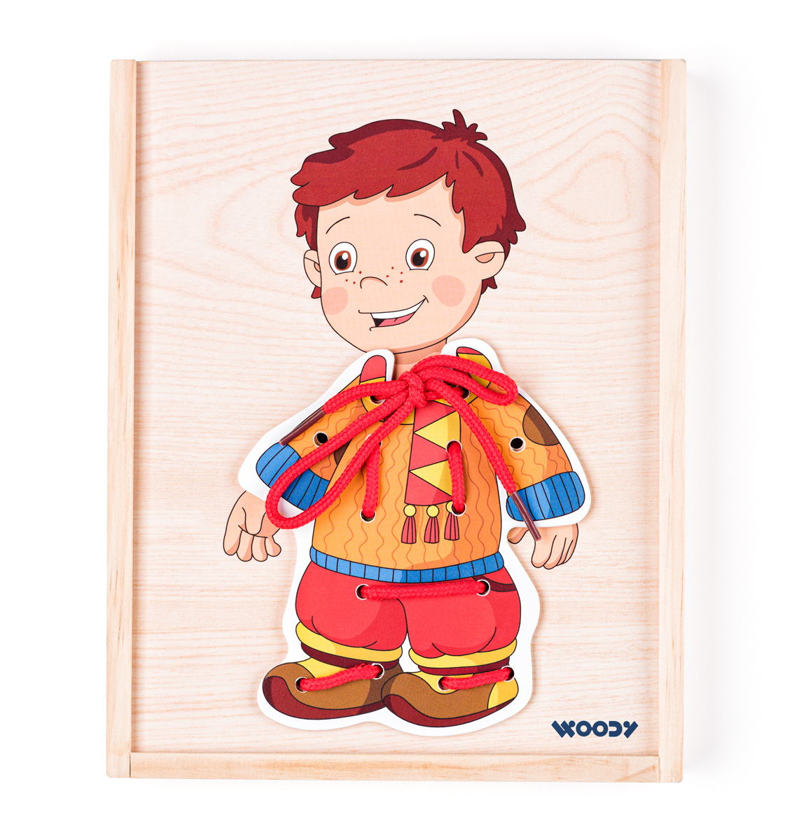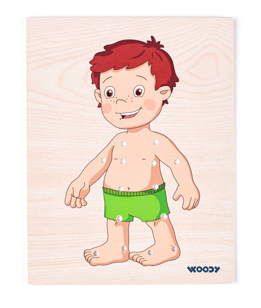 Děti mají možnost si dle vlastní fantazie oblékat postavičku chlapečka. K dispozici mají několik variant oblečení. Chlapec namalovaný na vysouvacím víku krabičky má na těle otvory, které umožňují přichycení oblečků tkaničkami. Design české výtvarnice. Součástí balení jsou 4 barevné tkaničky. Tato hračka rozvíjí jemnou motoriku, logiku a fantazii. | Věk: 3+ | Rozměr krabičky: 18,5 x 23 x 2,5 cmVíce