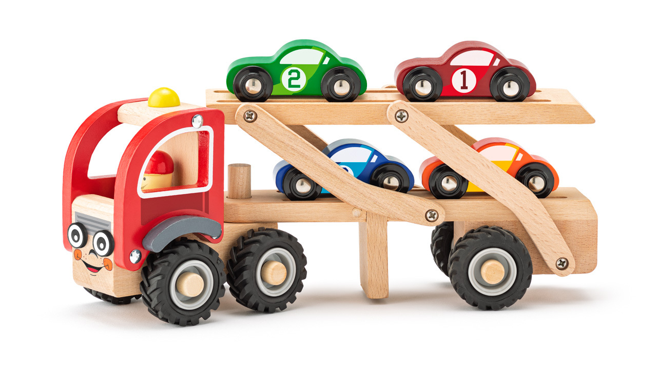 Tahač, návěs i auta jsou vyrobeny z tvrdého masivního dřeva. Patrová plošina pro auta se dá sklopit tak, aby auta mohla najet a zase sjet z rampy. Tahač a návěs se dají odpojit. Balení obsahuje: tahač, návěs a 4 auta. Rozměr: 27 x 8 x 11 cm | Věk: 3+