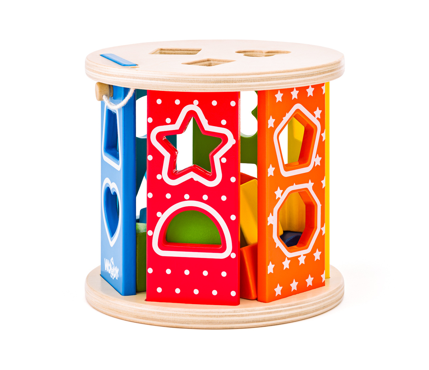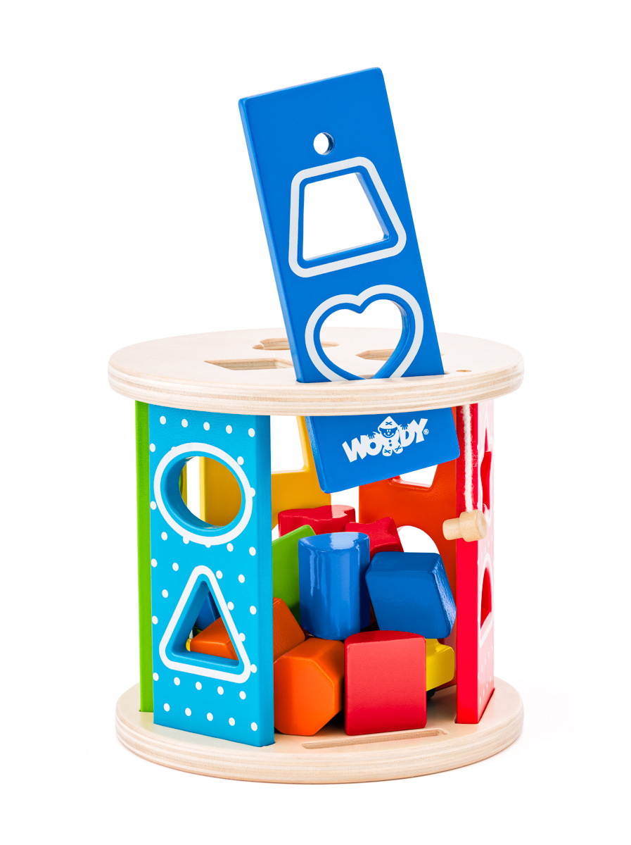 Vkládací válec s otvory pro 15 různých tvarů. Každý jiný. Úkolem dítěte je rozpoznat je a vložit správnými otvory dovnitř. Žádný tvar neprostrčíte otvorem, který mu nepřísluší. Poté, co jsou všechny tvary umístěné uvnitř, je možno uvolnit západku, vysunout jednu ze stěn válce a tvary znovu vysypat ven. Výrobek je z dílny mladého českého designéra. Sada obsahuje 15 ks kostek různých tvarů. Věk: 2+ | Rozměr: průměr 16x15 cm výška