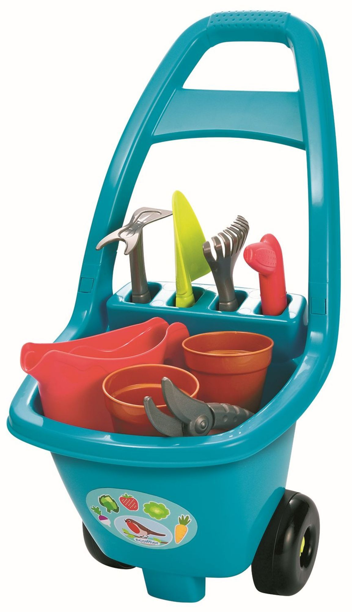Zahradní vozík na kolečkách pro malé zahradníky obsahuje vše potřebné, např. květináče, konvičku, zahradní nářadí. Rozměry vozíku: 26 x 50,5 x 33 cm. Hmotnost: 0,58 kg.