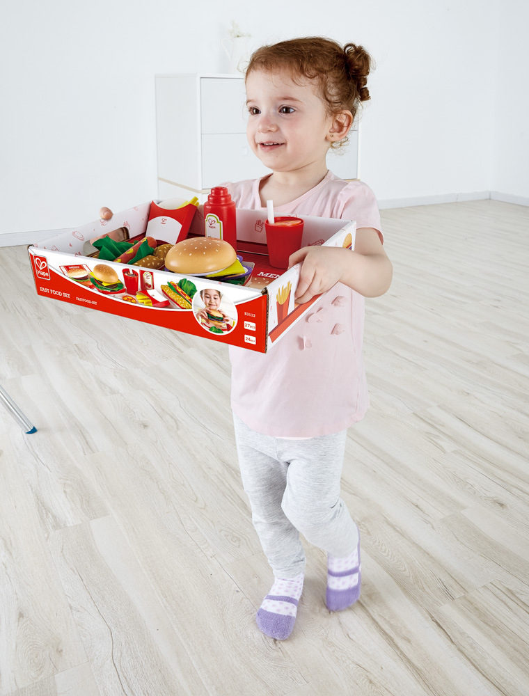 Co bude dnes k obědu? Na co máte zrovna chuť? Příprava oběda pomocí Fast Food Setu je snadná a rychlá. V setu najdete nejen menu, hranolky, hamburger, hot dog, ale i nápoj a kečup. Set obsahuje 27 dílků. Hračka rozvíjí jemnou motoriku, koordinaci rukou a očí. Vyrobeno z kvalitního a odolného materiálu. Věk: 3+. Rozměr balení: 20 x 24 x 10 cm.
