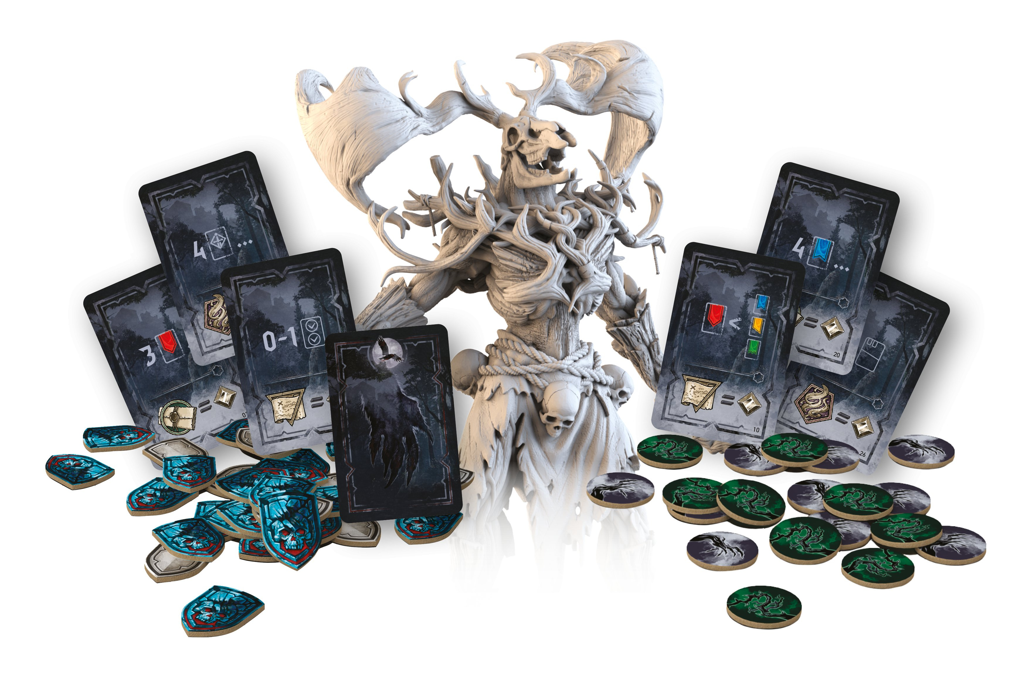 Obsah balení: 4 figurky legendárních nestvůr 8 karet legendárních nestvůr 8 karet pohybu nestvůr 27 karet stopování 8 karet runových kamenů 10 karet společníků 11 žetonů kořenů/utrpení 40 žetonů životů 1 oboustranné počitadlo životů nestvůr 1 kostka nestvůry česká pravidla