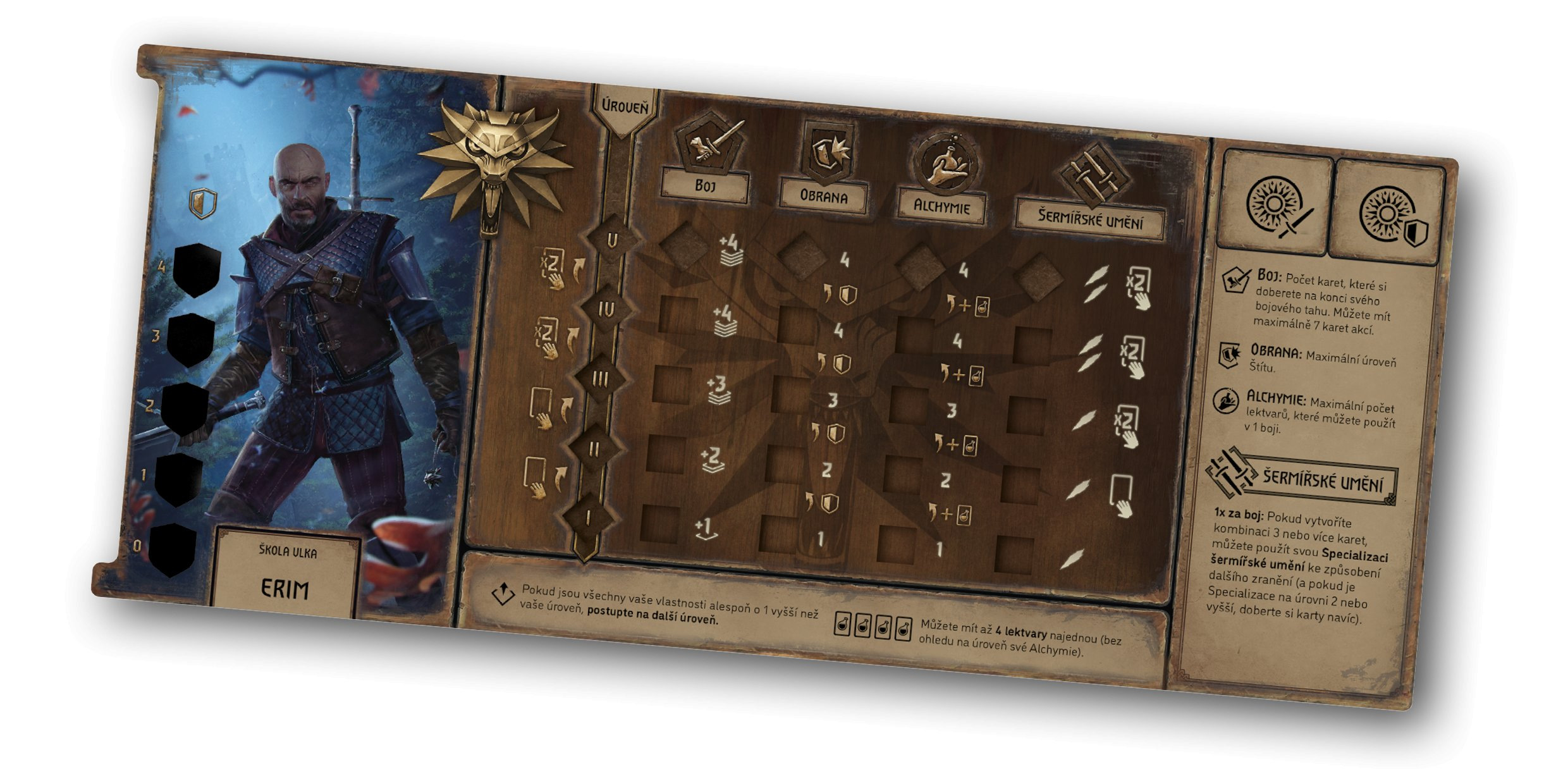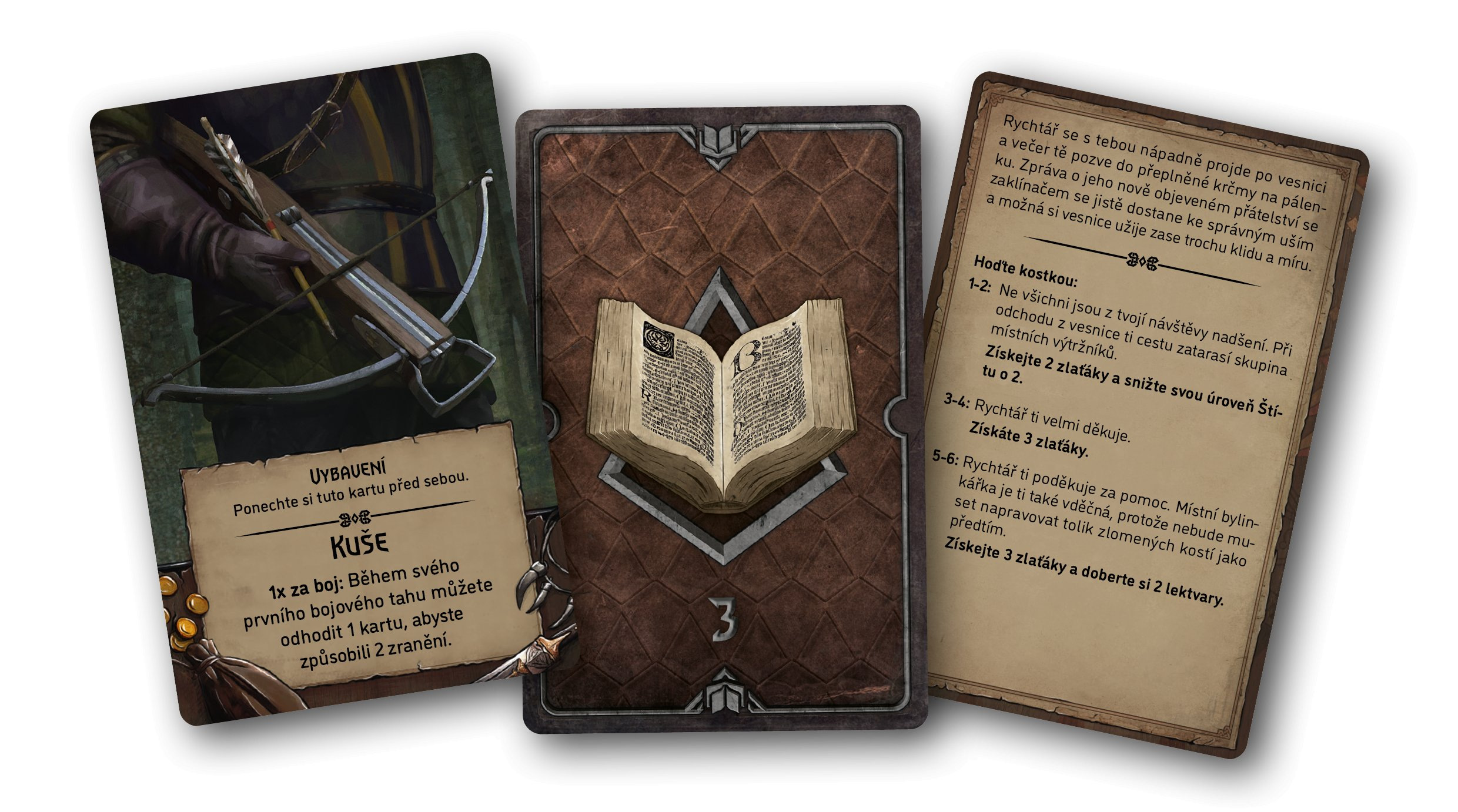 Obsah balení: 1 herní plán 5 figurek zaklínačů 28 figurek nestvůr 87 žetonů 30 dřevěných kostiček 10 kostek 383 karet 5 panelů hráče 1 pravidla
