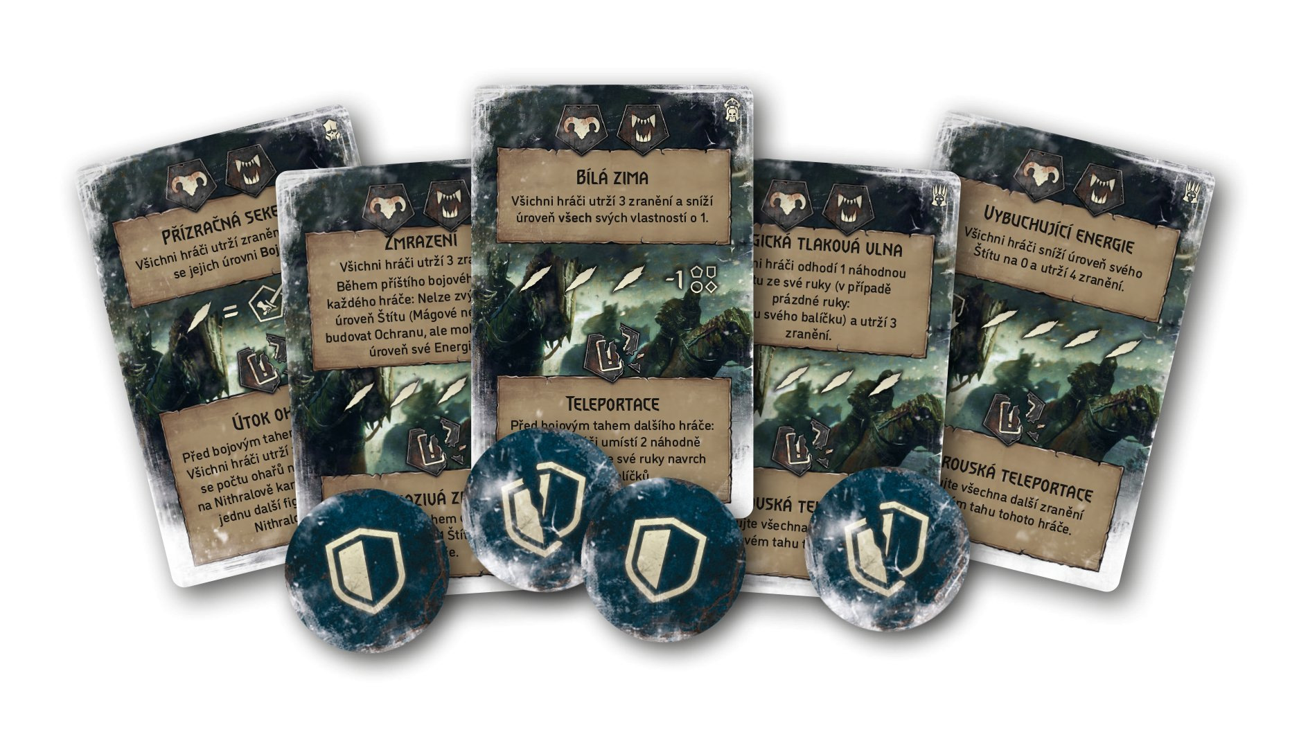 Obsah balení: 10 figurek 97 karet 39 žetonů 3 plány kol 1 pravidla