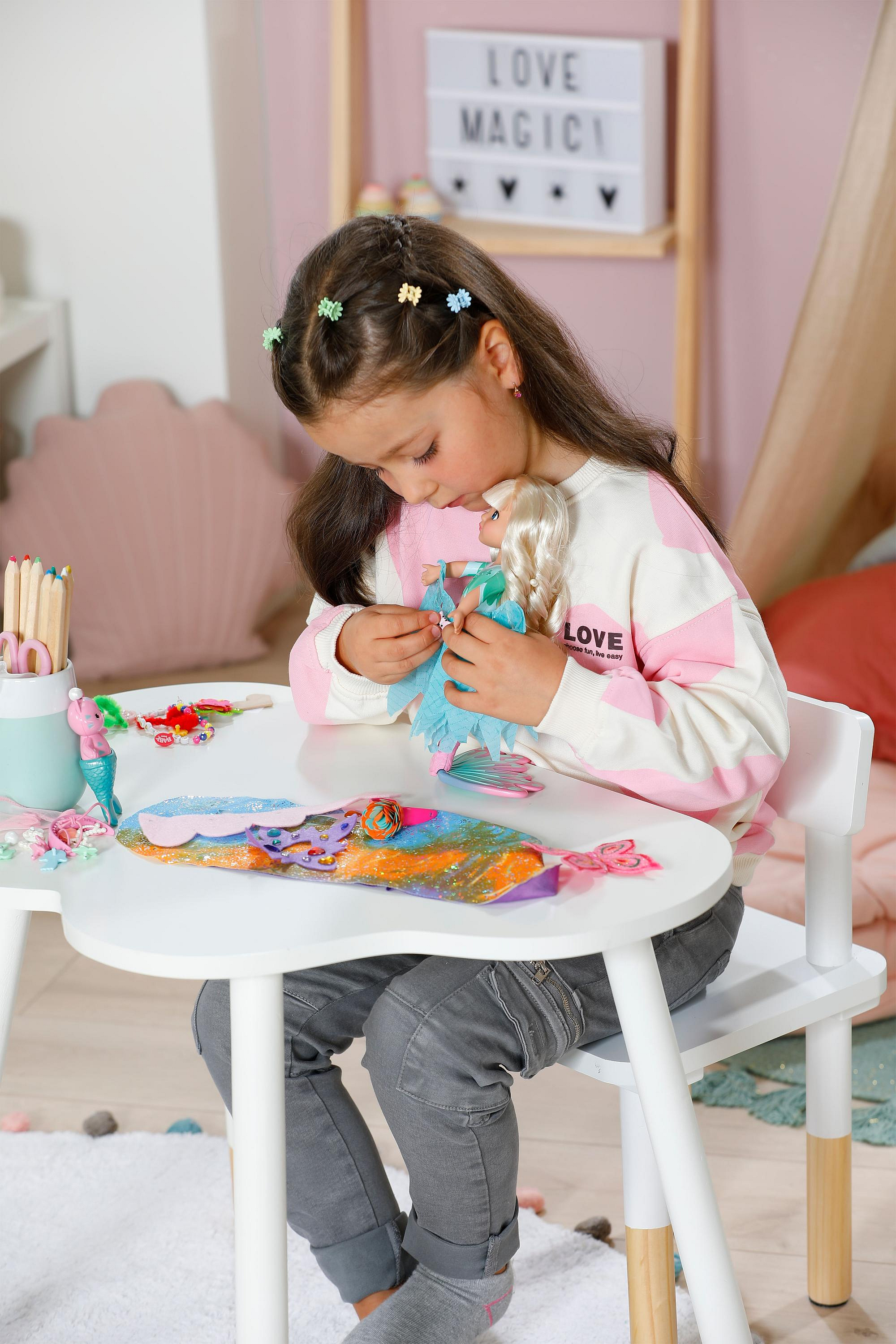 • Sparkle – Glam Up mořská víla s magickým UV barevným efektem • Blond vlasy mění na slunci barvu • Celou postavičku lze upravovat – od účesu až po ploutev • S textilními doplňky, barevnými nacvákavacími ozdobami, roztomilým zvířecím kamarádem a deníčkem plným inspirace • Pro kreativní česání, zdobení a hry plné fantazie • Vhodné pro děti od 4 let – kreativní zábava se stylingem a účesy plná lesku