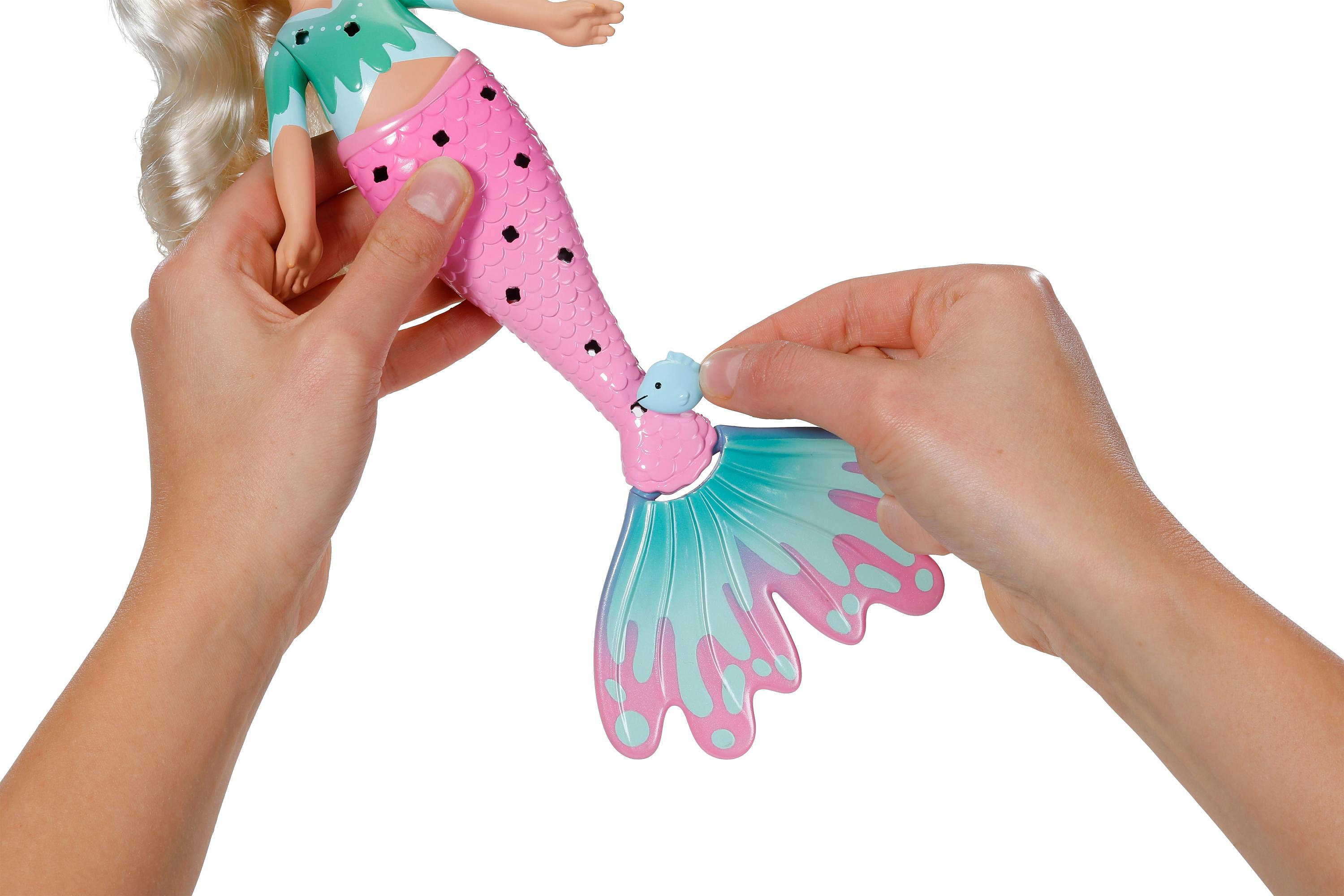 Vítejte ve světě BABY born Glam Up! Zde se vše točí kolem kreativity, třpytu a nekonečných možností tvoření. Glam Up mořské víly zvou děti, aby rozvíjely svou fantazii a každý detail upravovaly podle vlastního vkusu. Pokaždé jinak a originálně. Mořská víla Sparkle miluje proměny a hraní si s barvami. Od hlavy až po ploutev ji lze česat, zdobit a dekorovat podle vlastního stylu. Díky přiloženým textilním doplňkům, barevným nacvakávacím ozdobám a roztomilému zvířátku s odnímatelnou ploutví vznikají pokaždé nové vzhledy. Přiložená brožurka inspiruje k dalším nápadům i s materiály, které mají děti doma. Obzvlášť kouzelné jsou dlouhé blond vlasy Sparkle, které na slunci mění barvu a přinášejí skutečný wow efekt. Ať už jde o třpytivé účesy, kreativní dekorace nebo hry plné fantazie s BABY born Glam Up Sparkle objevují děti nekonečné možnosti tvoření a mohou nechat svou kreativitu volně plynout.