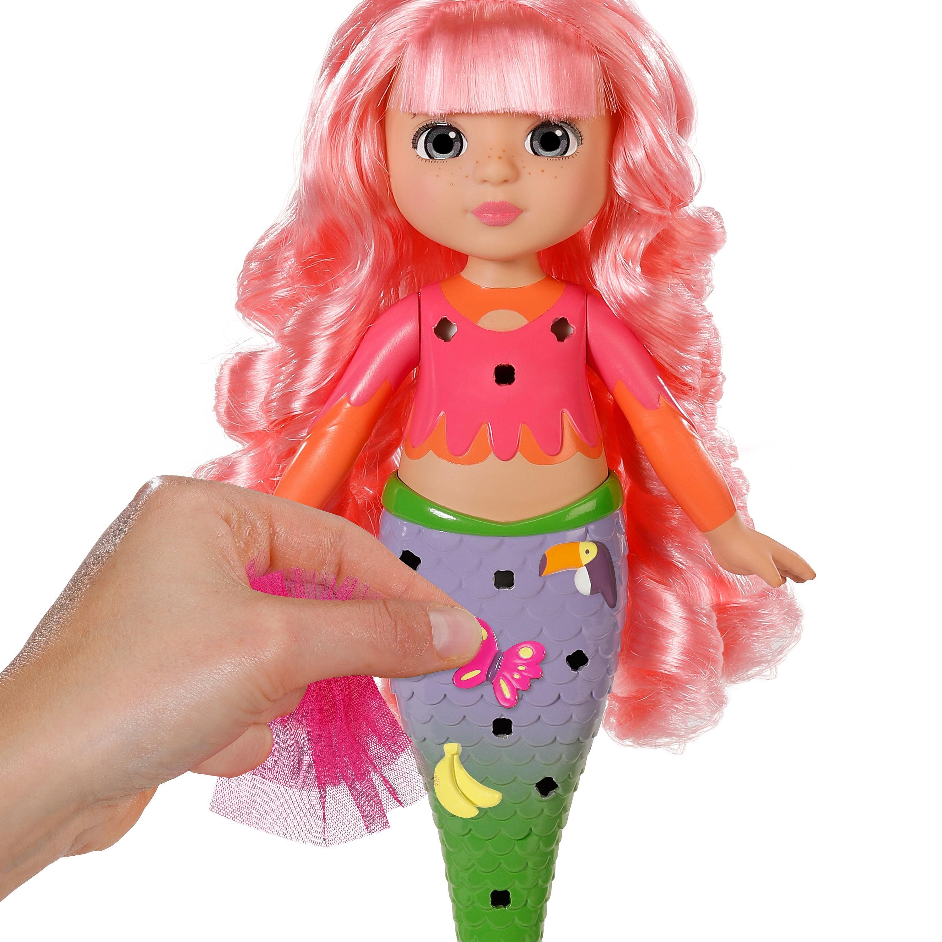 Vítejte ve světě BABY born Glam Up! Zde se vše točí kolem kreativity, třpytu a nekonečných možností tvoření. Glam Up mořské víly zvou děti, aby rozvíjely svou fantazii a každý detail upravovaly podle vlastního vkusu. Pokaždé jinak a originálně. Mořská víla Sunshine miluje proměny a hraní si s barvami. Od hlavy až po ploutev ji lze česat, zdobit a dekorovat podle vlastního stylu. Díky přiloženým textilním doplňkům, barevným nacvakávacím ozdobám a roztomilému zvířátku s odnímatelnou ploutví vznikají pokaždé nové vzhledy. Přiložená brožurka inspiruje k dalším nápadům i s materiály, které mají děti doma. Obzvlášť kouzelné jsou dlouhé růžové vlasy Sunshine, které na slunci mění barvu a přinášejí skutečný wow efekt. Ať už jde o třpytivé účesy, kreativní dekorace nebo hry plné fantazie s BABY born Glam Up Sunshine objevují děti nekonečné možnosti tvoření a mohou nechat svou kreativitu volně plynout.