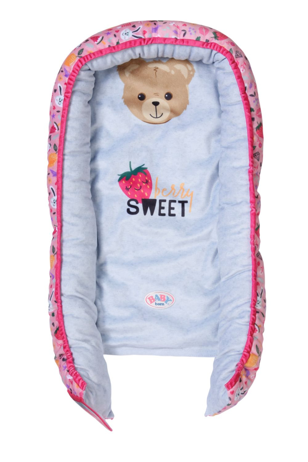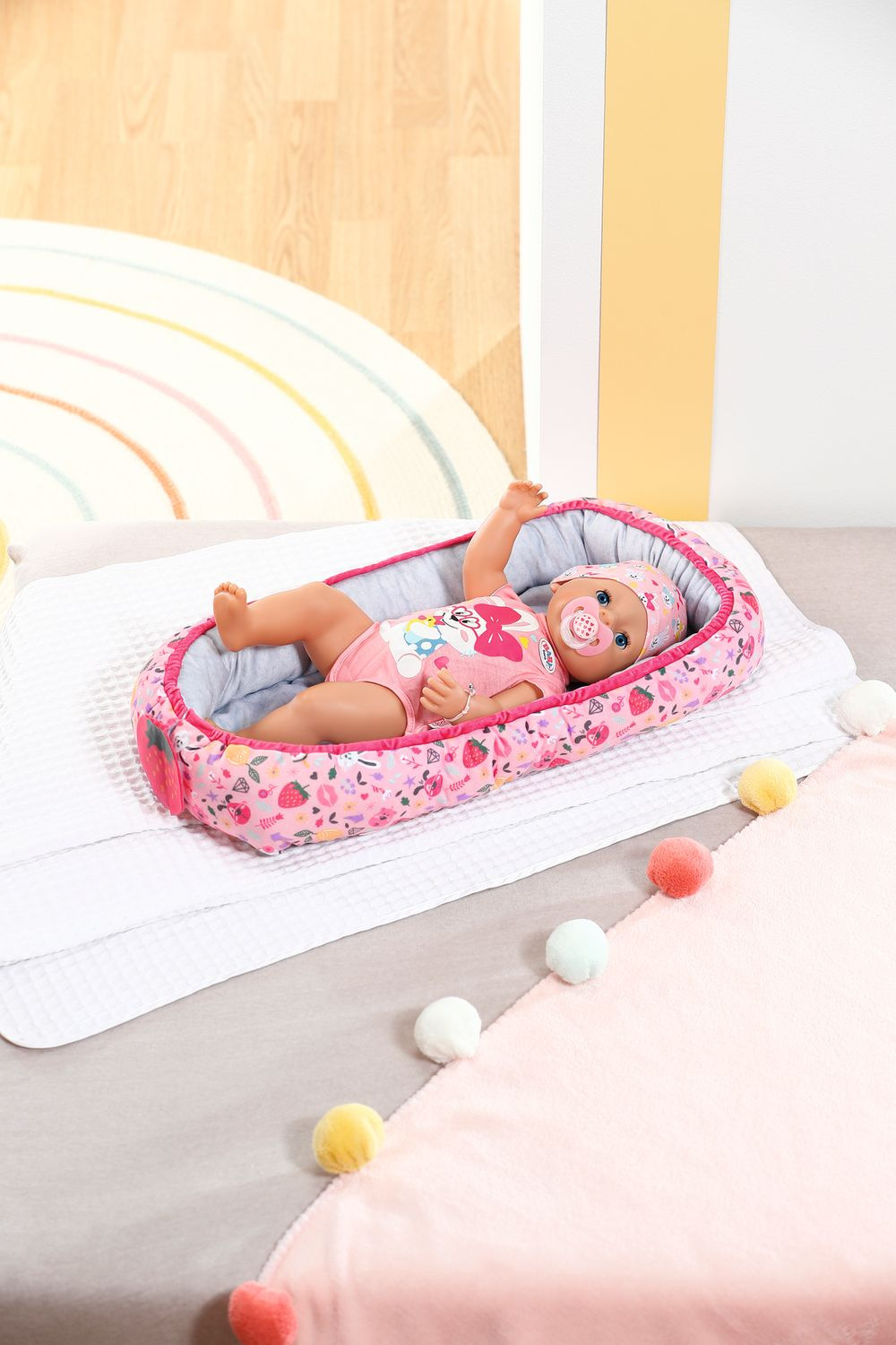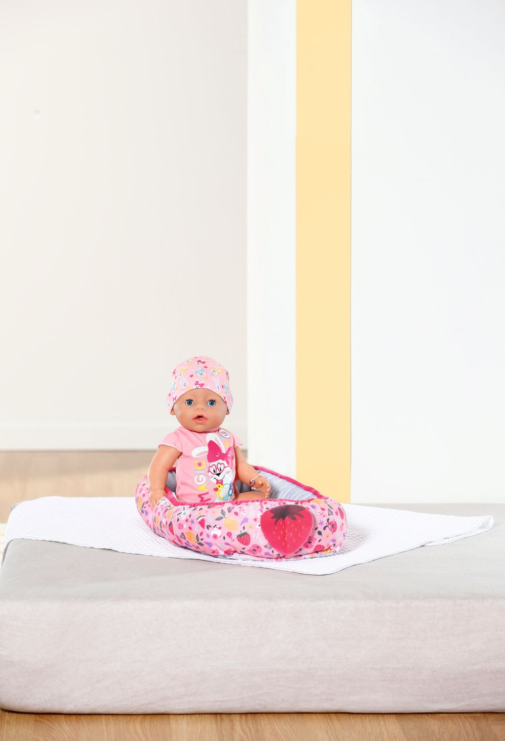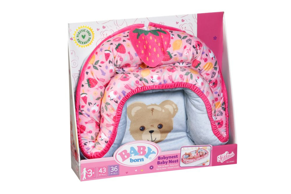 BABY born tiše leží ve svém hnízdečku a užívá si pohodlí. Barevné hnízdečko v hravém designu s obrázky ovoce a zvířátek má ve spodní části uzavíratelný otvor, takže BABY born lze snadno vyjmout z hnízdečka, vložit ji do něj a hrát si s ní v hnízdečku. Díky měkkému polstrovanému okraji je panenka v bezpečí a pohodlí, ať už je na pohovce nebo na podlaze v dětském pokoji. Díky oboustrannému designu se dokáže přizpůsobit svému okolí a zůstává pestrým doplňkem v dětském pokoji.