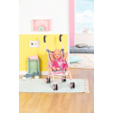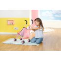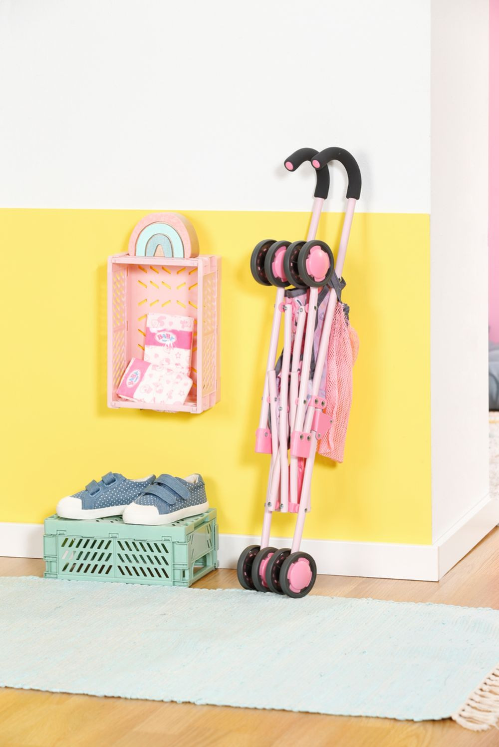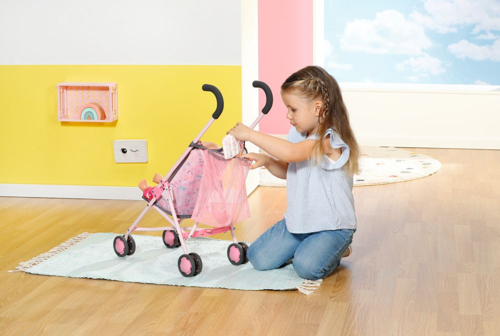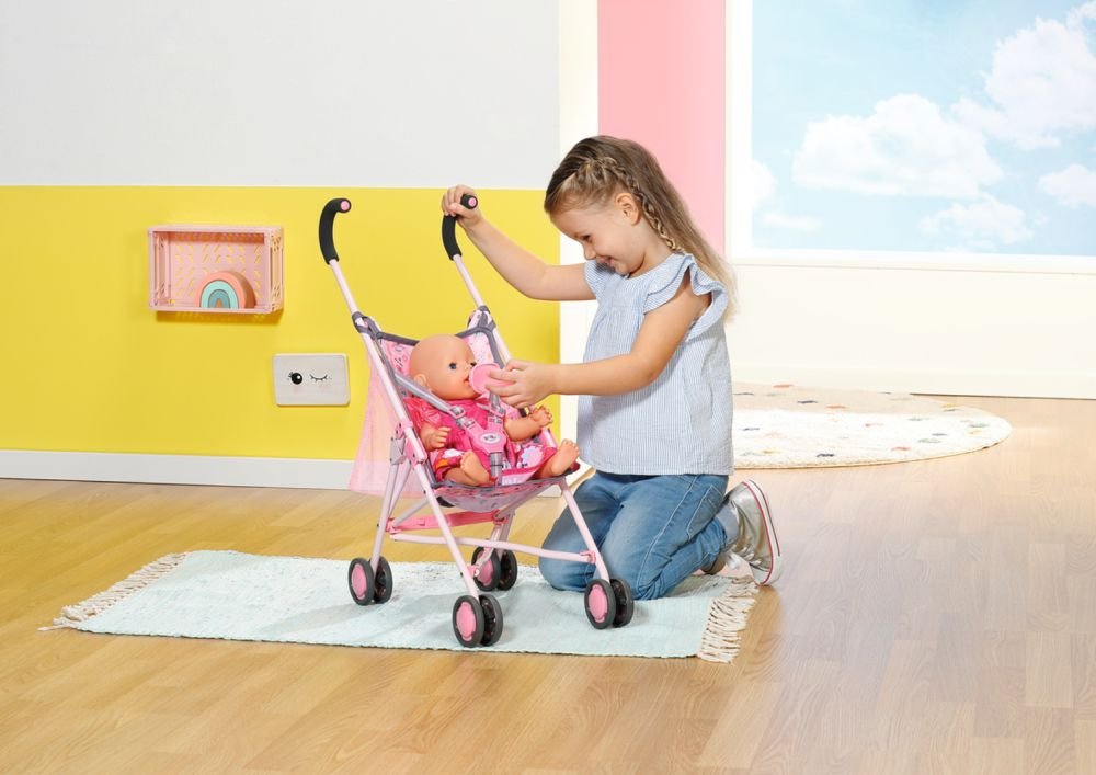 Na setkání s dětmi BABY born jezdí v šikovném kočárku. Je to totiž nejen ten nejrychlejší způsob, ale z kočárku má také o všem přehled a navíc si v něm může klidně zdřímnout. Systém bezpečnostních pásů drží panenku vždy v bezpečí sedadla. V nákupní síťce za sedadlem má své místo vše, co by BABY born mohla potřebovat na hraní a na piknik v parku. Díky měkkým pěnovým madlům kočárku jsou projížďky krajinou velmi pohodlné i pro rodiče panenek. Jamile je procházka u konce, lze růžový kočárek jednoduše složit, aby se v pokojíčku ušetřilo místo.