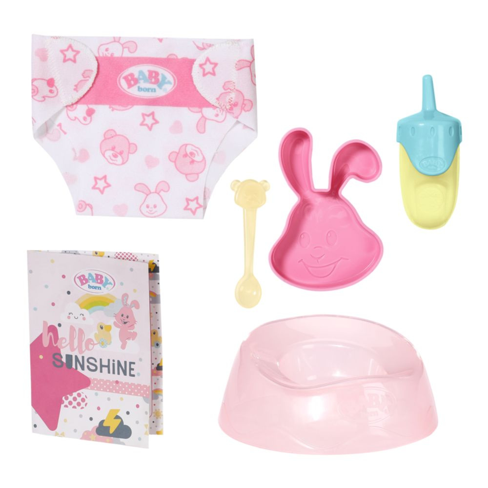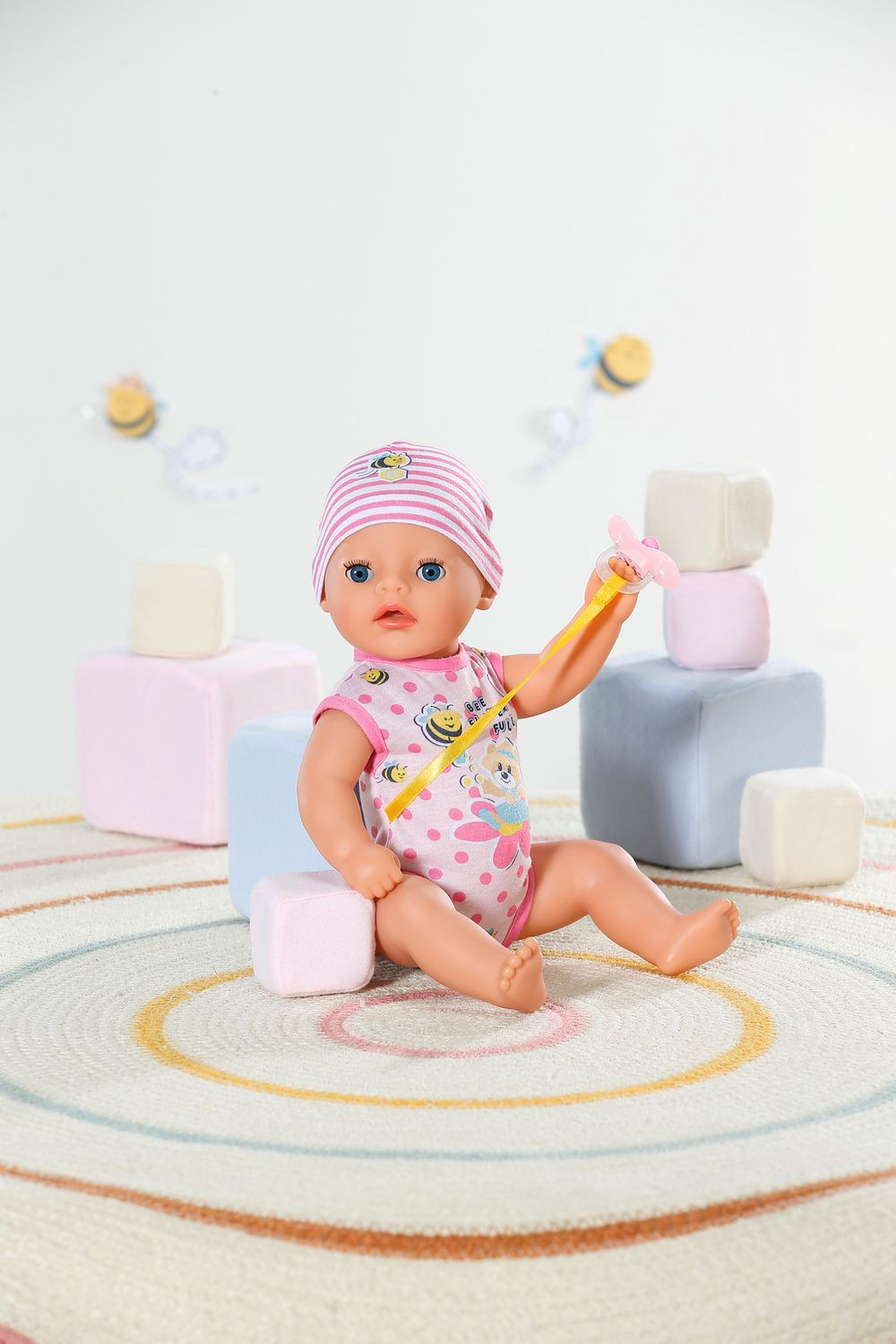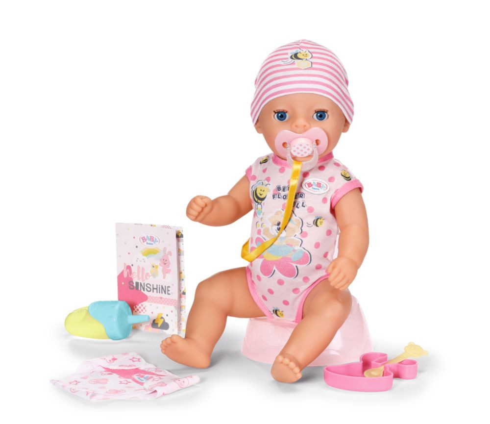 • Perfektní startovací panenka pro nejmenší: díky své velikosti 36 cm a nízké hmotnosti je panenka BABY born Little vhodná pro batolata od 1 roku. • Kouzelné oči: pokud otočíte dudlíkem, který je připevněný k oblečku, oči se kouzelně otevřou a zavřou. • Má 7 funkcí odpovídajících věku dítěte: BABY born Little umí pít, čůrat, chodit na nočník, může se koupat a zavírá oči. Má pohyblivé klouby a součástí balení je kouzelný dudlík. Se všemi funkcemi si mohou snadno hrát malé děti. • Funguje bez baterií: BABY born Little funguje čistě mechanicky, a proto ji lze vzít i do vany. • V balení najdete: panenku BABY born Little velikosti 36 cm v dupačkách, čepičku, nočník, 1 látkovou plenku, 1 lahvičku, 1 talířek se lžičkou, 1 dudlík a 1 rodný list.