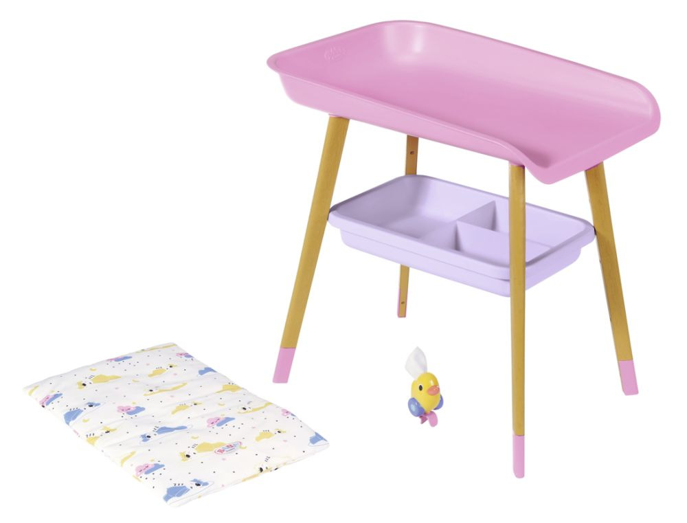 Špatně přebaleno? To se s přebalovacím stolem BABY born nemůže stát. Stůl ve skandinávském stylu má nohy ve vzhledu dřeva a skvěle se hodí do dětského pokojíčku k Jídelní židličce a Stojanu na oblečení. Zatímco panenka BABY born leží na měkké přebalovací podložce, kačenka Berta sleduje přebalování a kromě toho, že BABY born utěšuje, také nabízí ubrousky. V trojdílné přihrádce pod přebalovací podložkou lze uložit čisté plenky, oblečení nebo hračky.