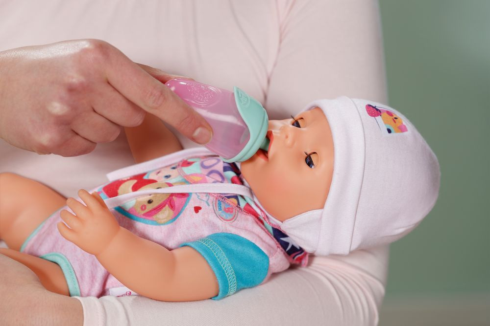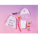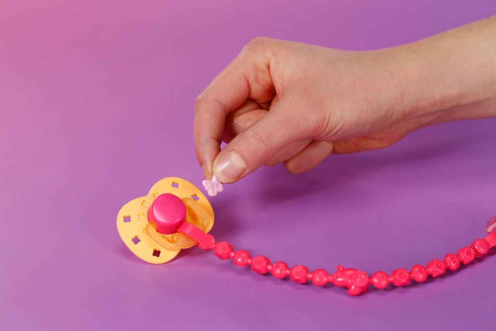 BABY born Sada pro novorozence obsahující čepičku, plenku, chrastítko, bryndáček, dudlík vhodný k ozdobení a řetízek na dudlík. • Obsahuje lahvičku, čepičku, plenku, bryndáček, chrastítko, dudlík a řetízek na dudlík • U některých panenek kouzelný dudlík pomáhá zavírat oči • Přizpůsobitelné: Dudlík lze dozdobit nacvakávacími ozdobami (nejsou součástí balení) • Dudlík a lahvička jsou vhodné pro panenky velikosti 43 cm • Výrazné barvy odpovídající aktuálním trendům pro svěží a stylový vzhled