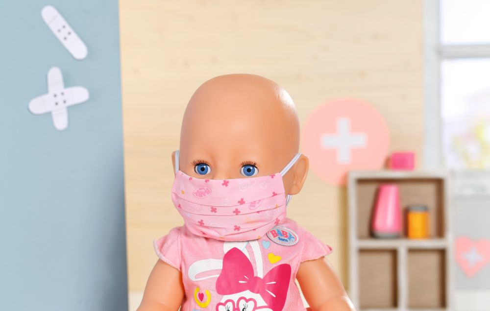 Zcela profesionálně jako opravdový záchranář si hned nasazuje růžovou roušku. Pak z tašky vytáhne vše, co potřebuje k ošetření rozbitého kolene panenky BABY born. Tubu s mastí a obvaz, který nůžkami ještě trochu upraví. Jakmile BABY born spatří krabičku s léky a lžičku s medicínou, vykulí oči. Léky ale zatím naštěstí nepotřebuje. Bratříček záchranář chce raději ještě změřit teplotu. Malá kaskadérka ji má z rozrušení trochu zvýšenou. Třeba by se ohřívací láhev mohla změnit na chladicí polštářek. Poté bratříček všech 9 zdravotních pomůcek schová zpět do látkového sáčku, který zdobí obrázek zdravotní kačenky Berty.
