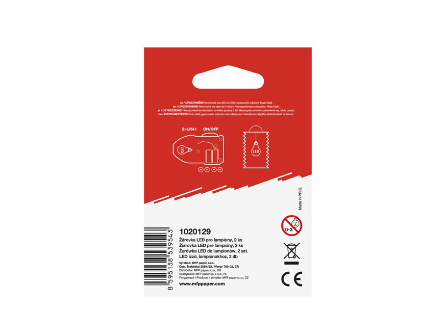 Žárovka do Lampiónu. Svítící LED zařízení, které je možné použít jak do lampionu tak i třeba do klasického balonku. Jednoduše žárovku rozsvítíte posunutím jezdce do prava, v opačném případě ji zhasnete. Žárovka je napájena dvěma mikro bateriemi LR41 a je možné ji používat opakovaně.OBSAH BALENÍ: - 2 ks žárovek (včetně baterií)VAROVÁNÍ:Nevhodné pro děti do 3 let. Nebezpečí vdechnutí a spolknutí malých částic.Uvedená cena je za 1 balení.