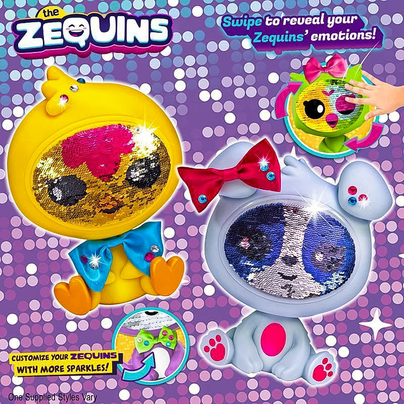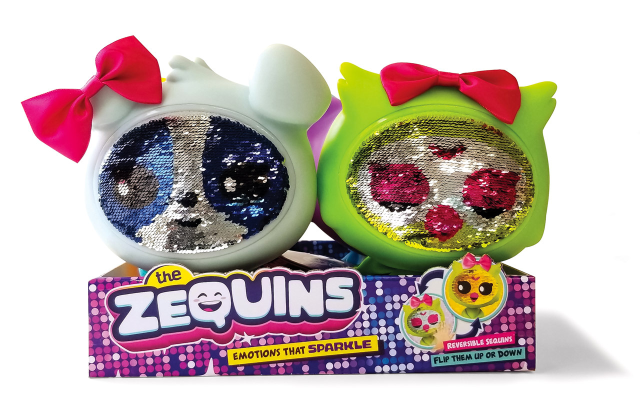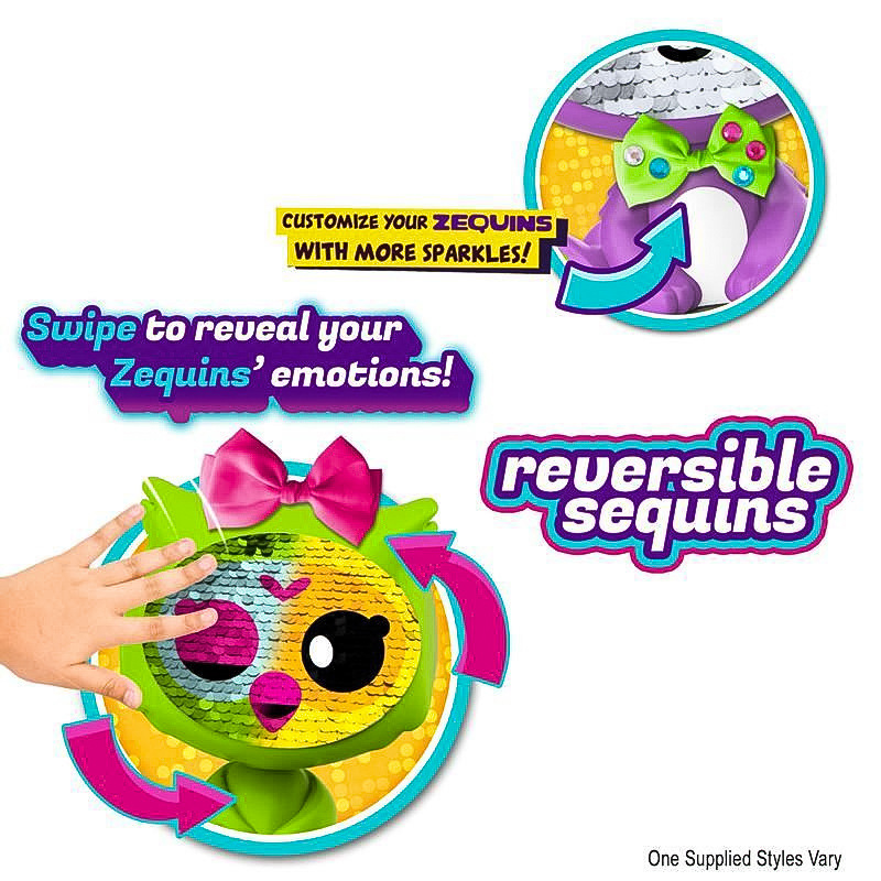 Chceš vědět jako má tvoje Zequins dnes náladu? Stačí projet rukou na flitrovém obličeji a vše je jasné! Když budeš chtít může se mračit nebo byt zvědavá! Podívej se jak se nálada tvoje Zequins mění pouhým pohybem ruky. Přesuň třpytky na obličeji a Zequins je úplně jiná! Můžeš měnit kdy chceš, celou nebo jenom část - je to jen na tobě. Ukaž všem jak se dnes ty a Zequins máte. Ukaž své emoce prostřednictvím Zequins, hraj si s kamarádky. 6 druhu.https://youtu.be/L8qJEaDs7D4Více