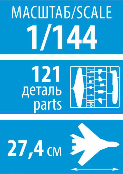 Model letadla ke slepení. Velikost: 1:144; 29,4 cm. Počet dílků: 104. Informace o originálu: