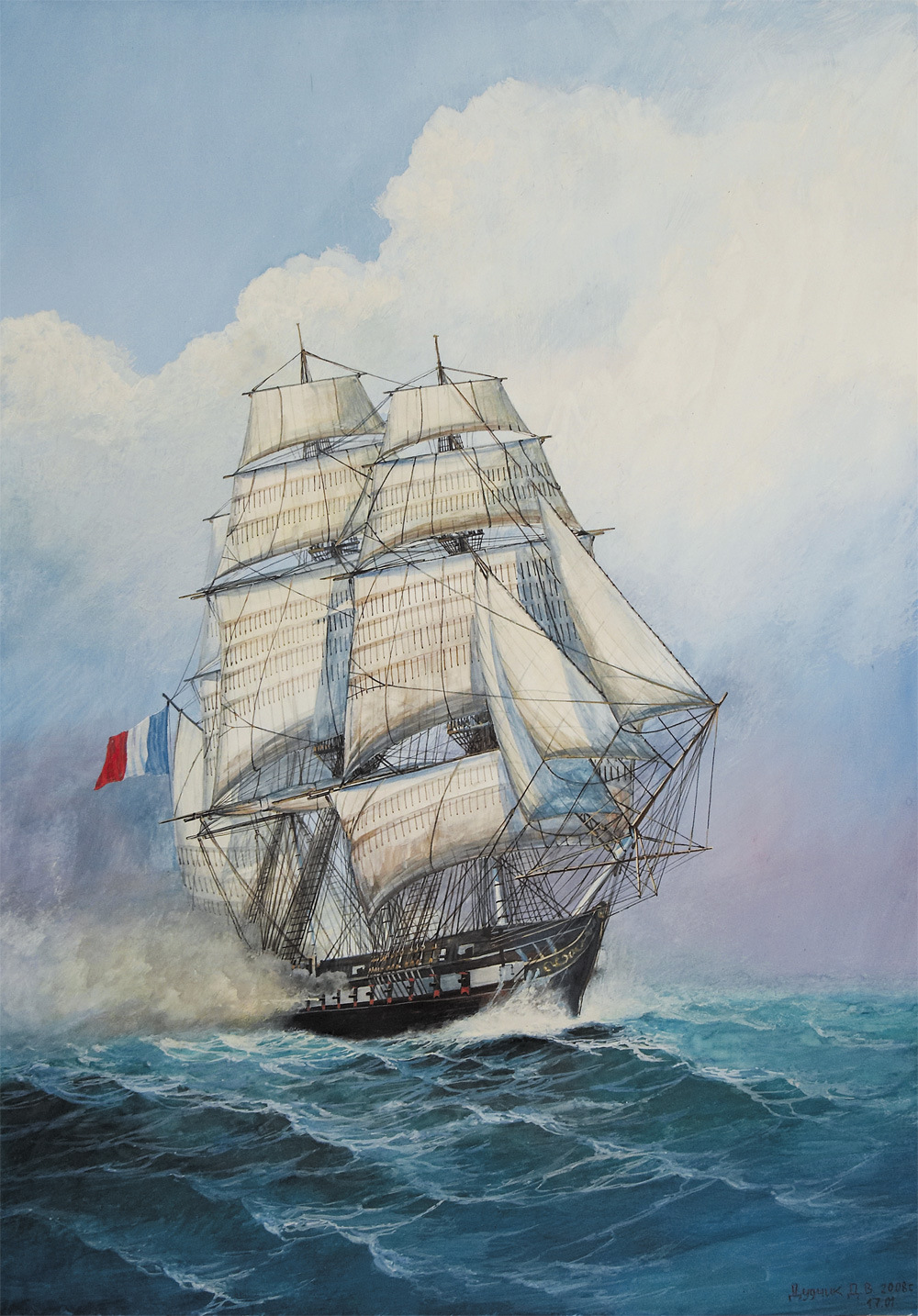 Model lodě ke slepení. Měřítko: 1:350; velikost: 37 cm. Počet dílků: 306. Informace o originálu: