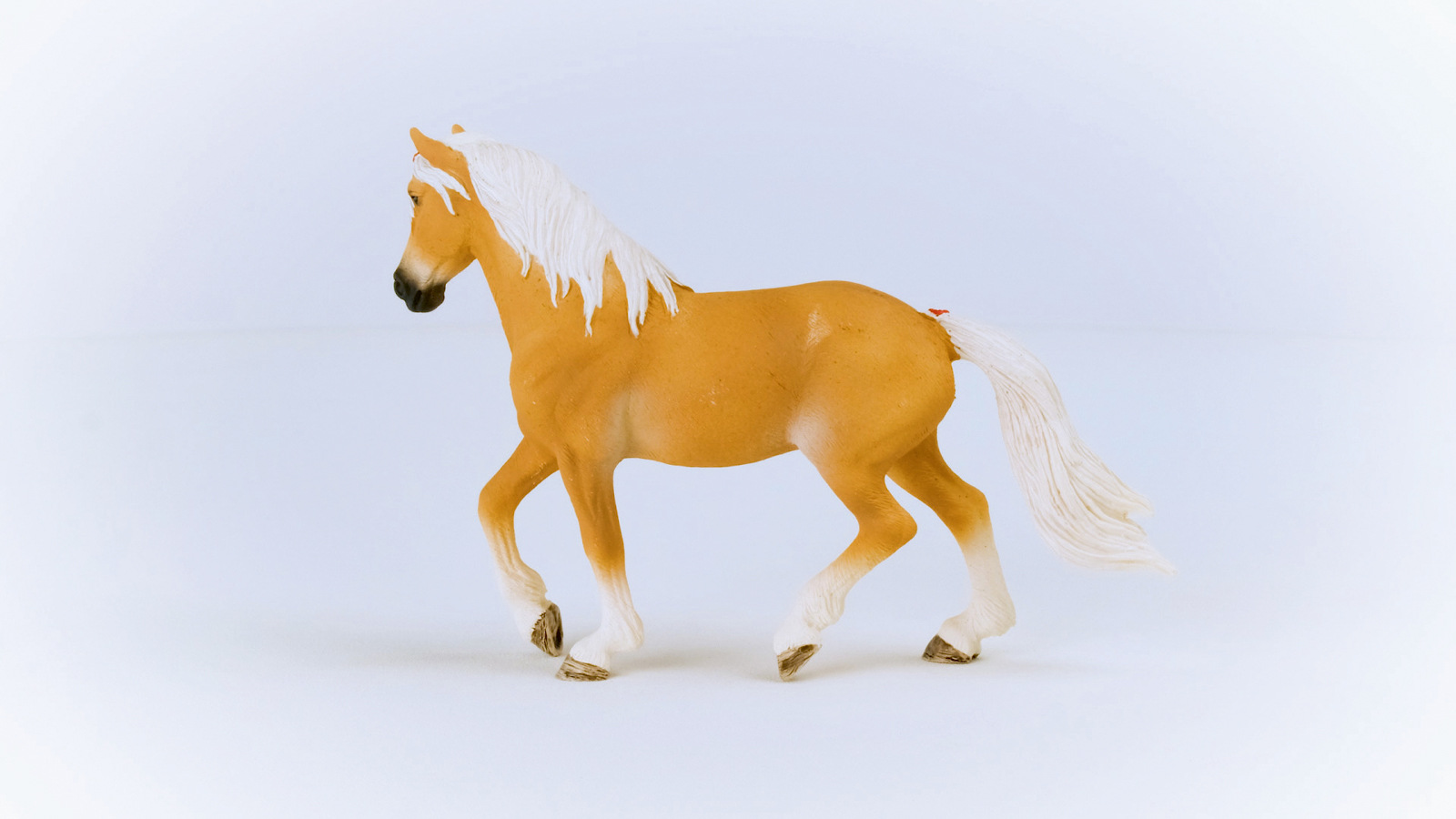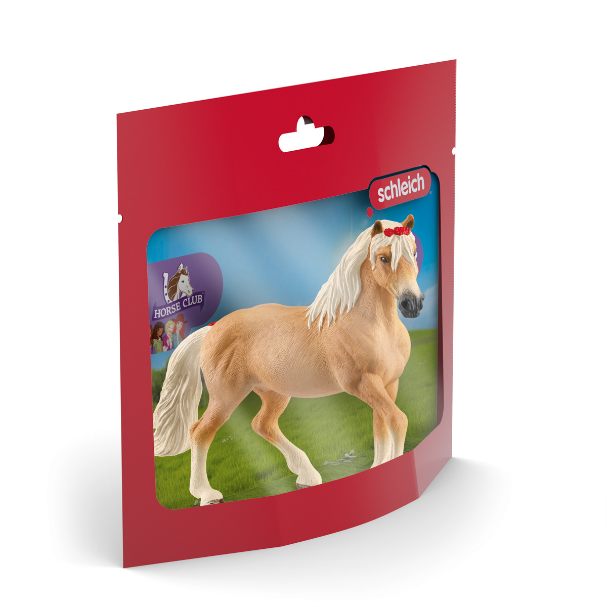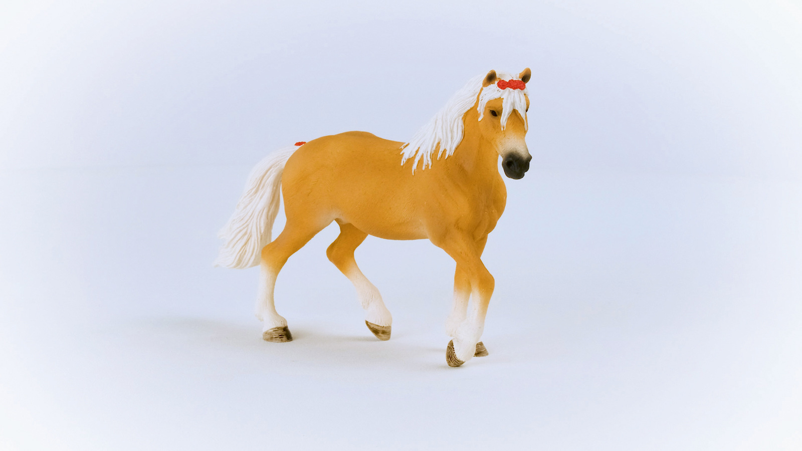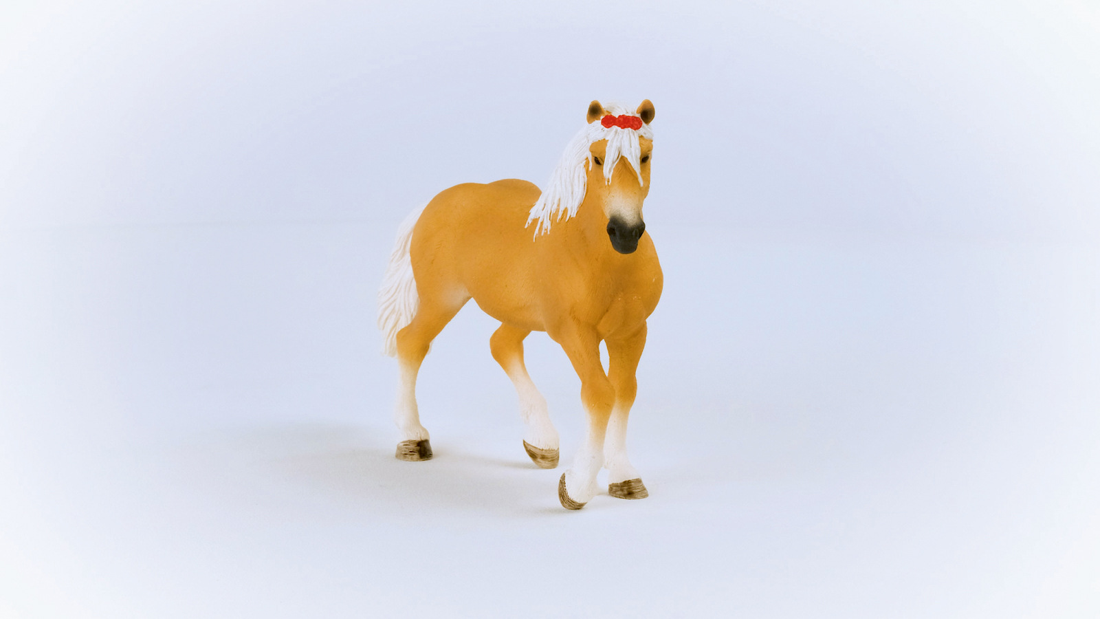 Hříbata haflinga dostávají po narození jméno složené z počátečních písmen jména svého otce a své matky. Jejich srst je vždy rezavá, hříva a ocas jsou světlé. Někdy mají fleky nebo lysiny jako znamení na hlavě, jinak jsou ale v podstatě jednobarevní. Jako dospělí dosahují výšky od 138 do 155 centimetrů. Jelikož je u koně požadovaná výška v kohoutku nejméně 148 centimetrů, a haflingští koně se tak často berou jako poníci, tvoří vlastně koňské plemeno. Haflingové mají často nápadnou světlou tlamu. Rozměr: 9,3 x 7,7 x 3,2 cm. Nevhodné pro děti do 3 let. Doporučený věk: 5-12