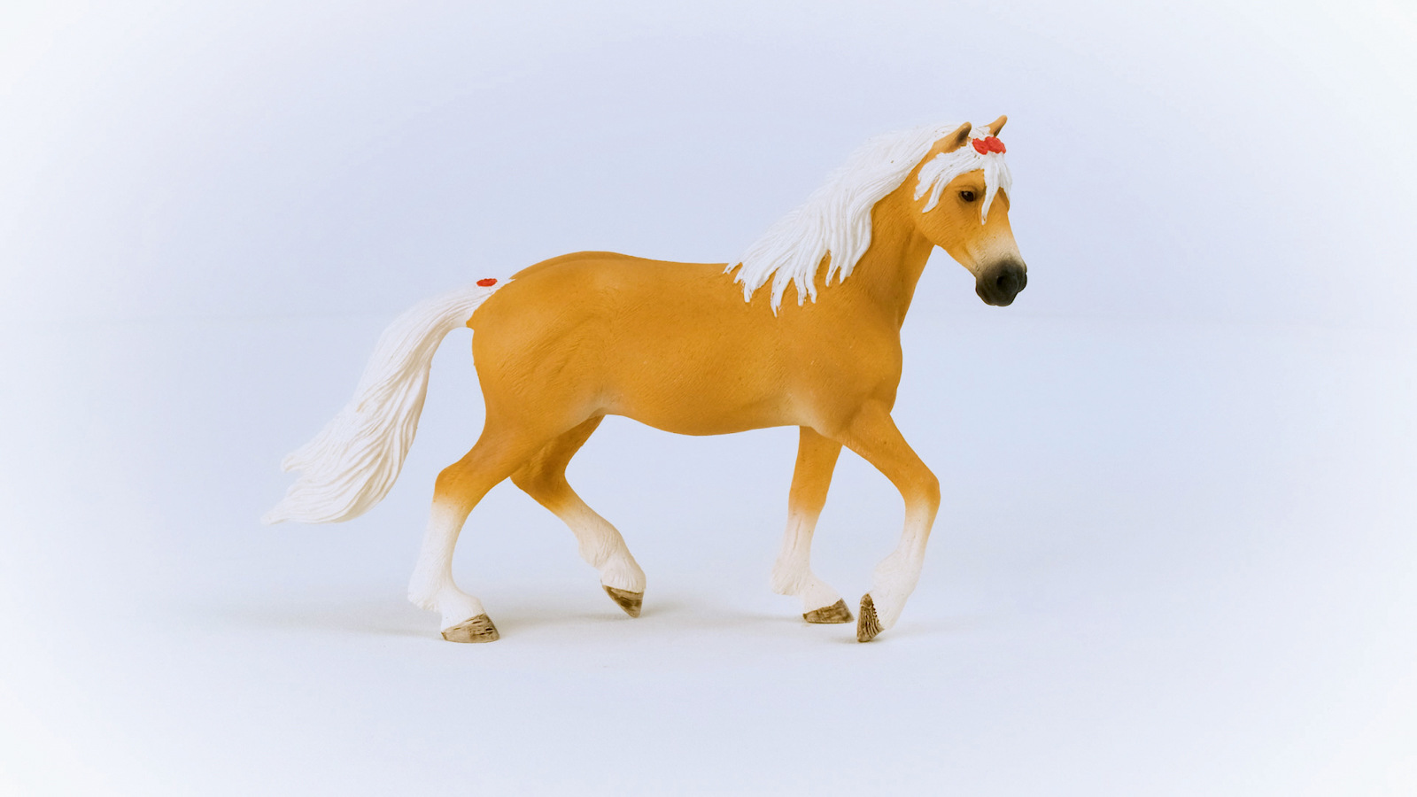 Přátelská haflingerská klisna si šťastně vyklusává po pastvině. Že by měla dnes náladu na projížďku? Proč by se jinak tak vymódila? Nevypadá s tou svou rudou mašlí ve hřívě nádherně? Zajímalo by mě, jestli její přátelé už objevili tu maličkou mašli, kterou má připnutou na ocase. Rozhodně chce, aby si jí někdo všímal, to je 100% jisté! Rozměry: 15x9,5x3,3cm. Vhodně pro děto od 3 let.