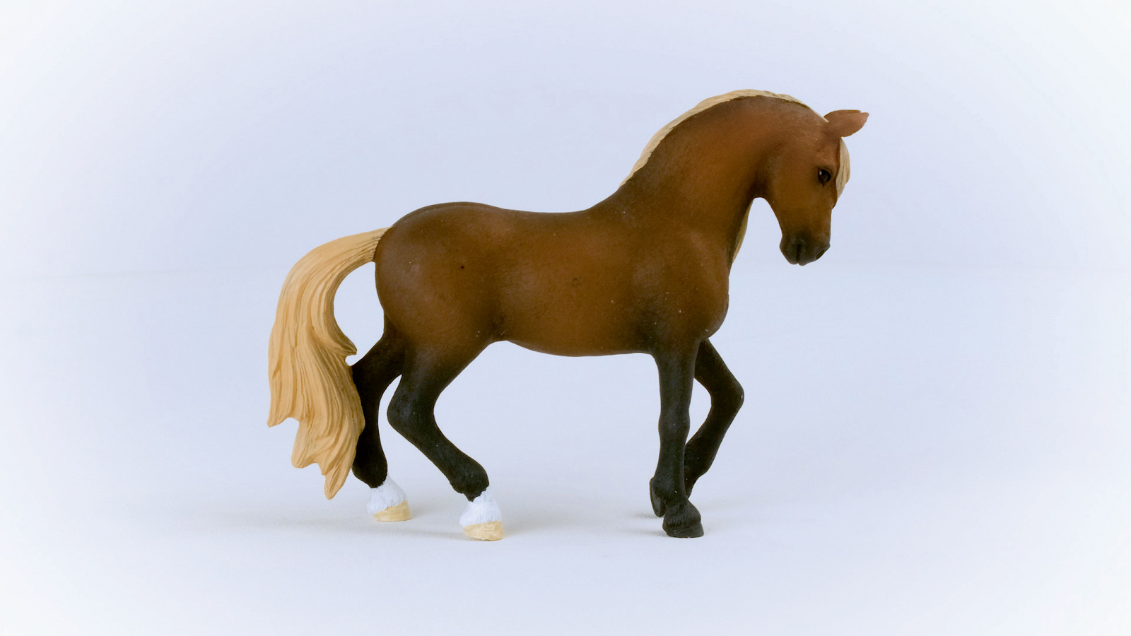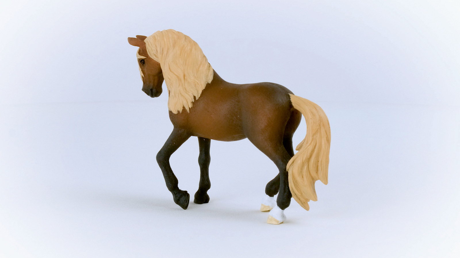 Jen sleduj, jak se tenhle hrdý hřebec plemene peruánský paso prohání po zahradě! Se svou bujnou hřívou a elegantně prohnutým krkem přitahuje pozornost všech. Pozorně střihá svýma hezkýma ušima. Možná čeká, že na další přehlídce vyhraje všechna ocenění? Rozhodně na to vypadá! Může předvést svou speciální chůzi Paso Llano, kterou ovládají jen koně plemene peruánský paso. Rozměry: 14x10,5x3,5cm. Vhodné pro děti od 3 let.