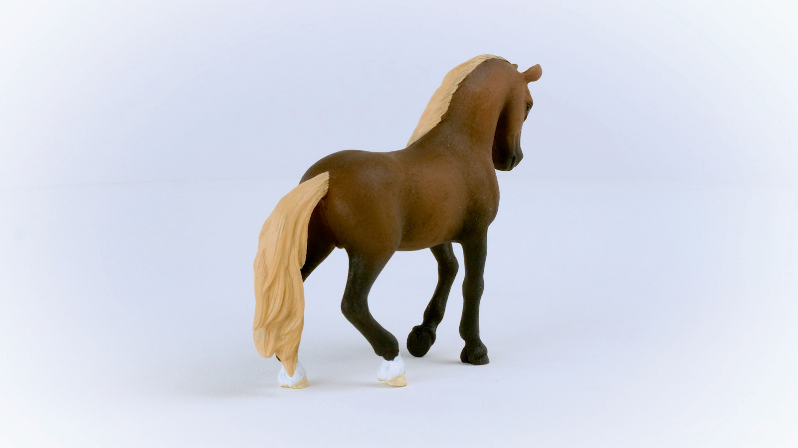 Jen chovní andaluští koně zapsaní v plemenné knize mohou být označováni jako čisté, španělské plemeno (PRE). Pro zápis do chovu se musí kůň registrovat a musí mu být udělena licence. Udělení licence probíhá jako prohlídka, u které se hodnotí druhy chůze a stavba těla. Andaluští koně jsou téměř vždy bělouši. S hnědáky, vraníky, ryzáky a plaváky se u nich člověk setká málokdy. Rozměr figurky: 11,1 x 13,5 x 4,1 cm. Nevhodné pro děti do 3 let. Doporučený věk: 5-12 let.