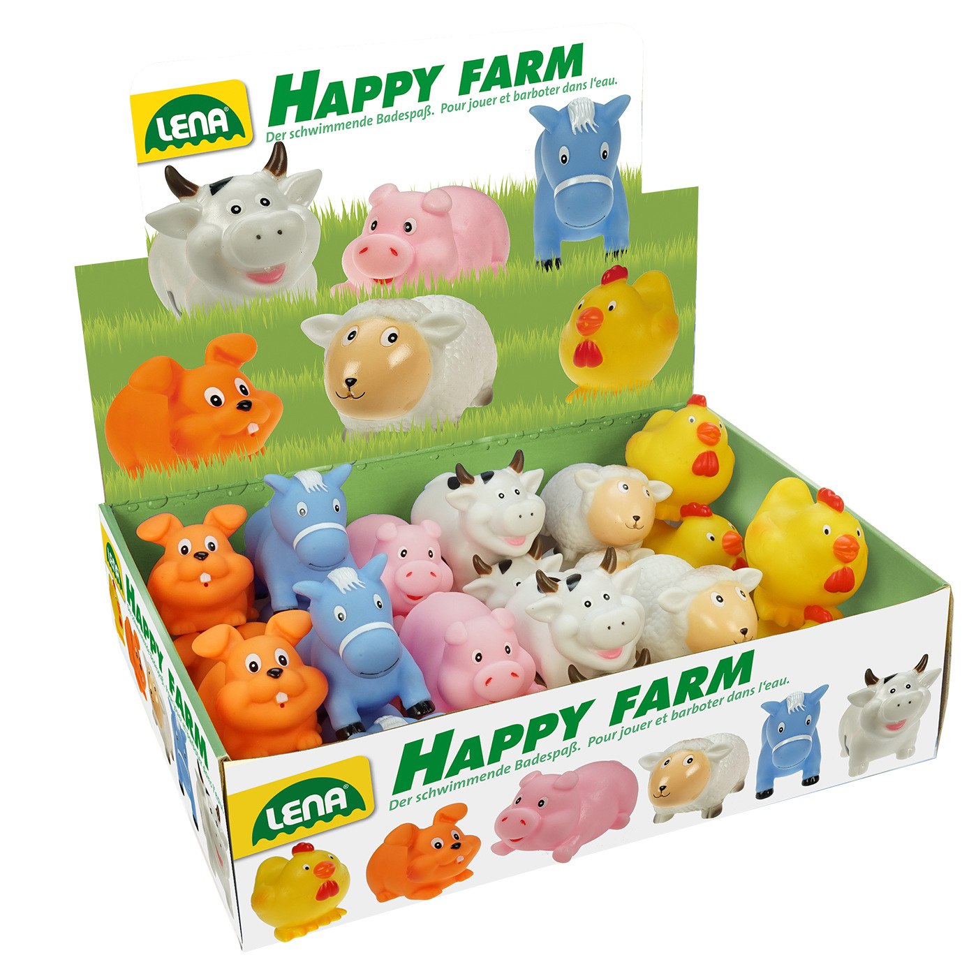 Gumová stříkací zvířátka farma obsahuje králíčka, oslíka, prasátko, kravičku, ovečku a kuřátko. Rozměr 7 cm. Vhodné od 12 měsíců.